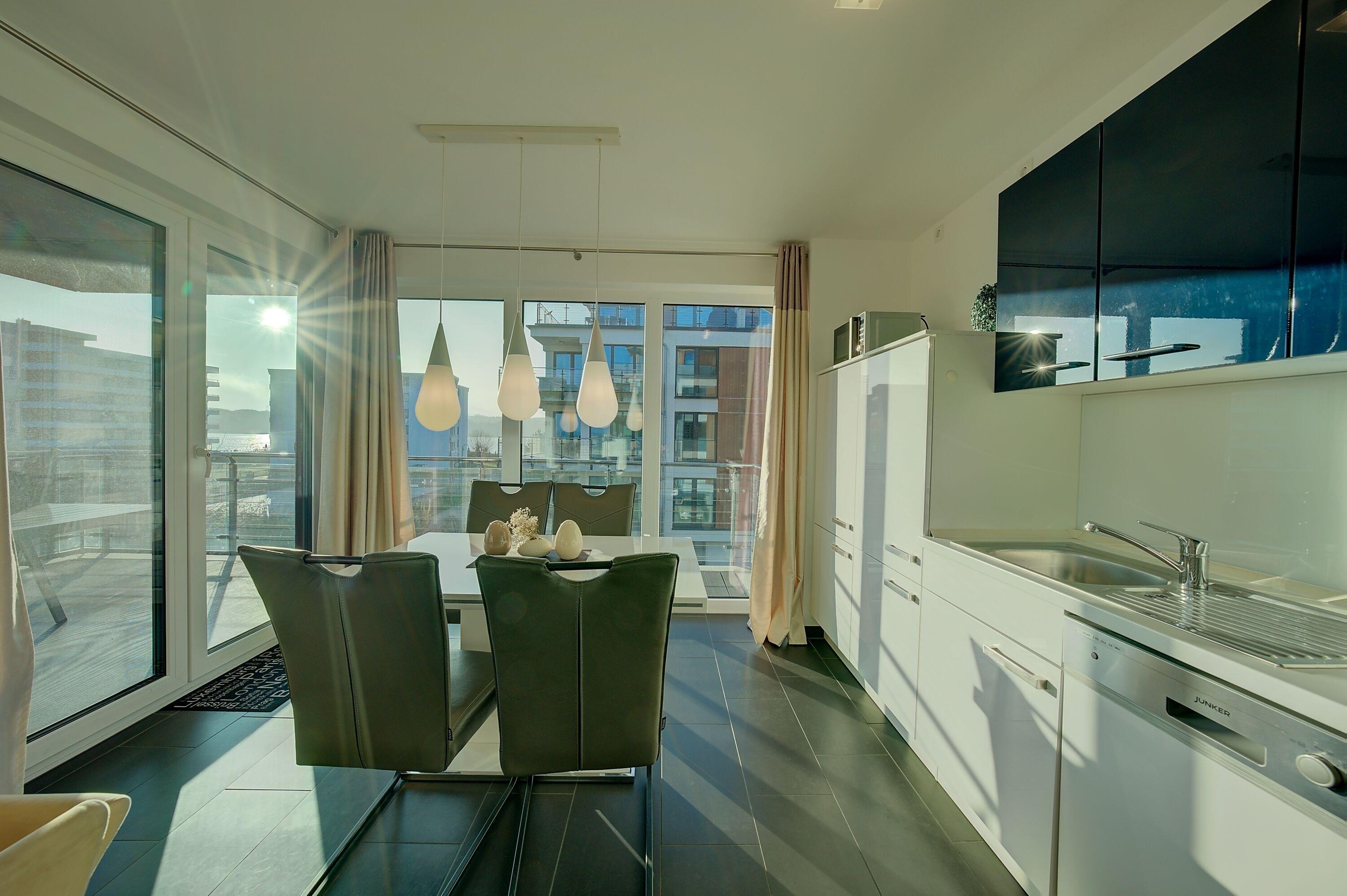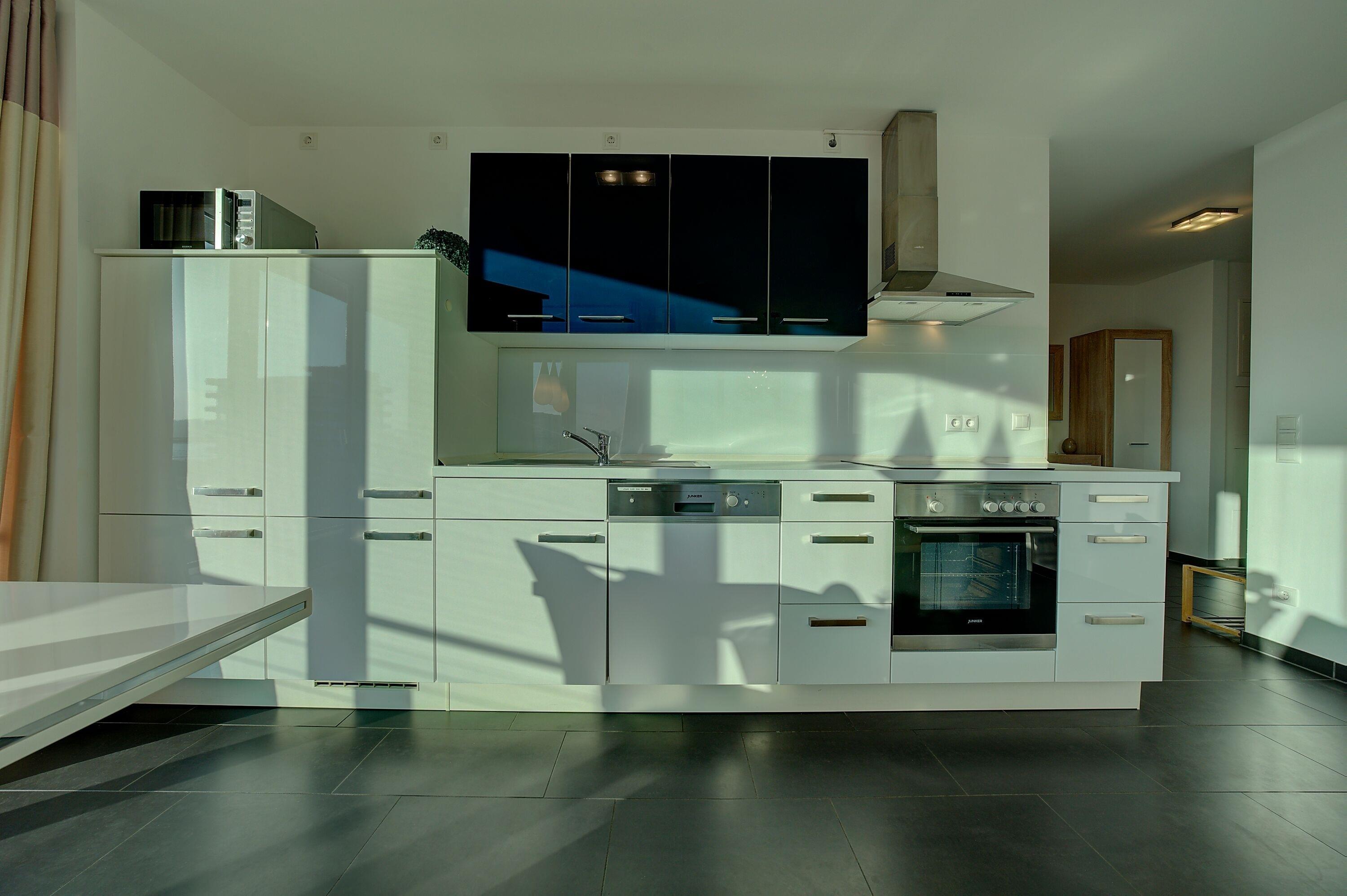 Die offen gestaltete Küchenzeile ist vollständig auf den Urlaubsbedarf abgestimmt und lässt keine Wünsche offen. Ein Backofen, Geschirrspüler, Kaffeemaschine, Wasserkocher und Toaster stehen ebenso zur Verfügung wie ausreichend Geschirr und Besteck – perfekt für ein entspanntes Frühstück oder selbst zubereitete Mahlzeiten zwischendurch.