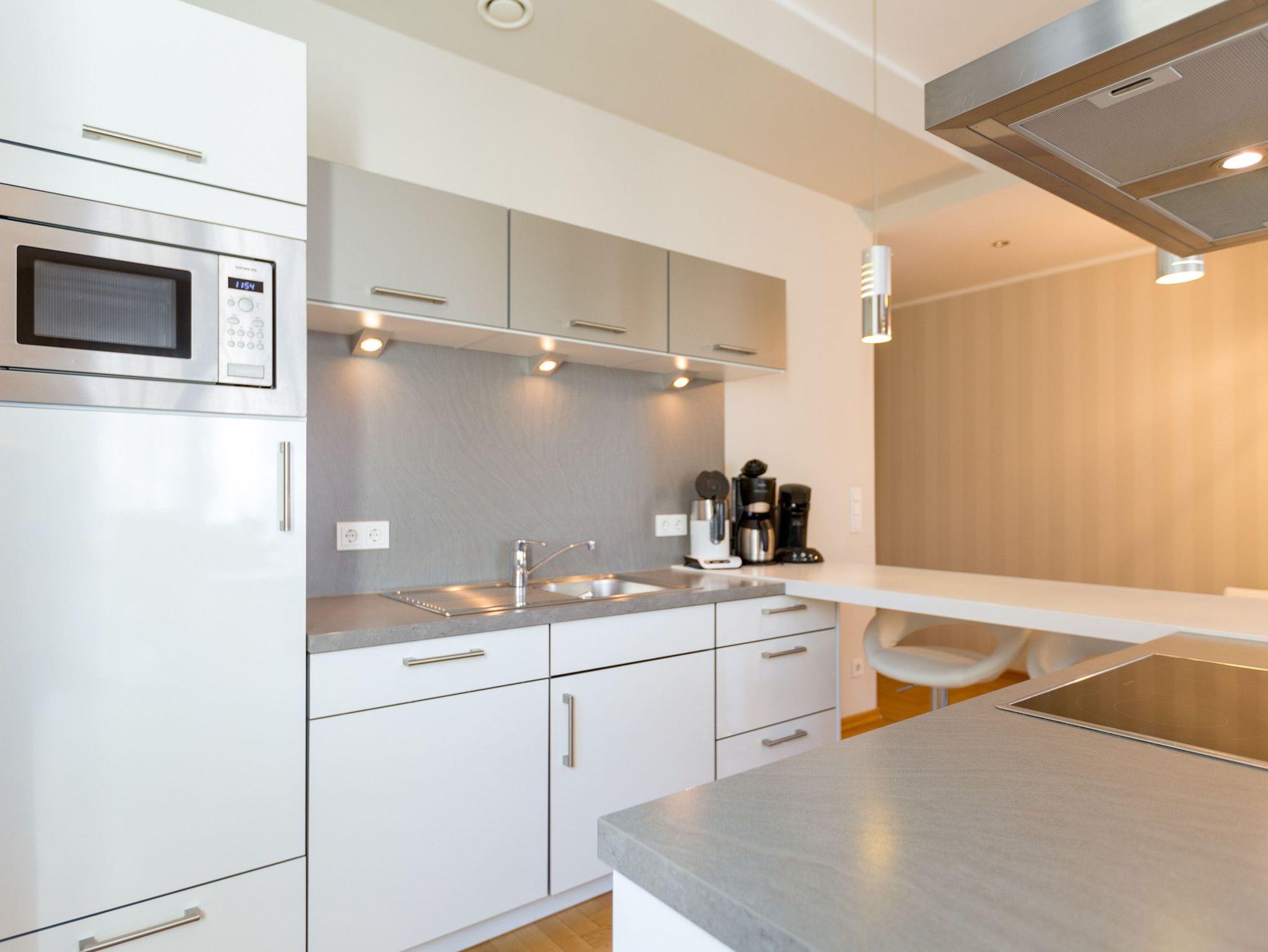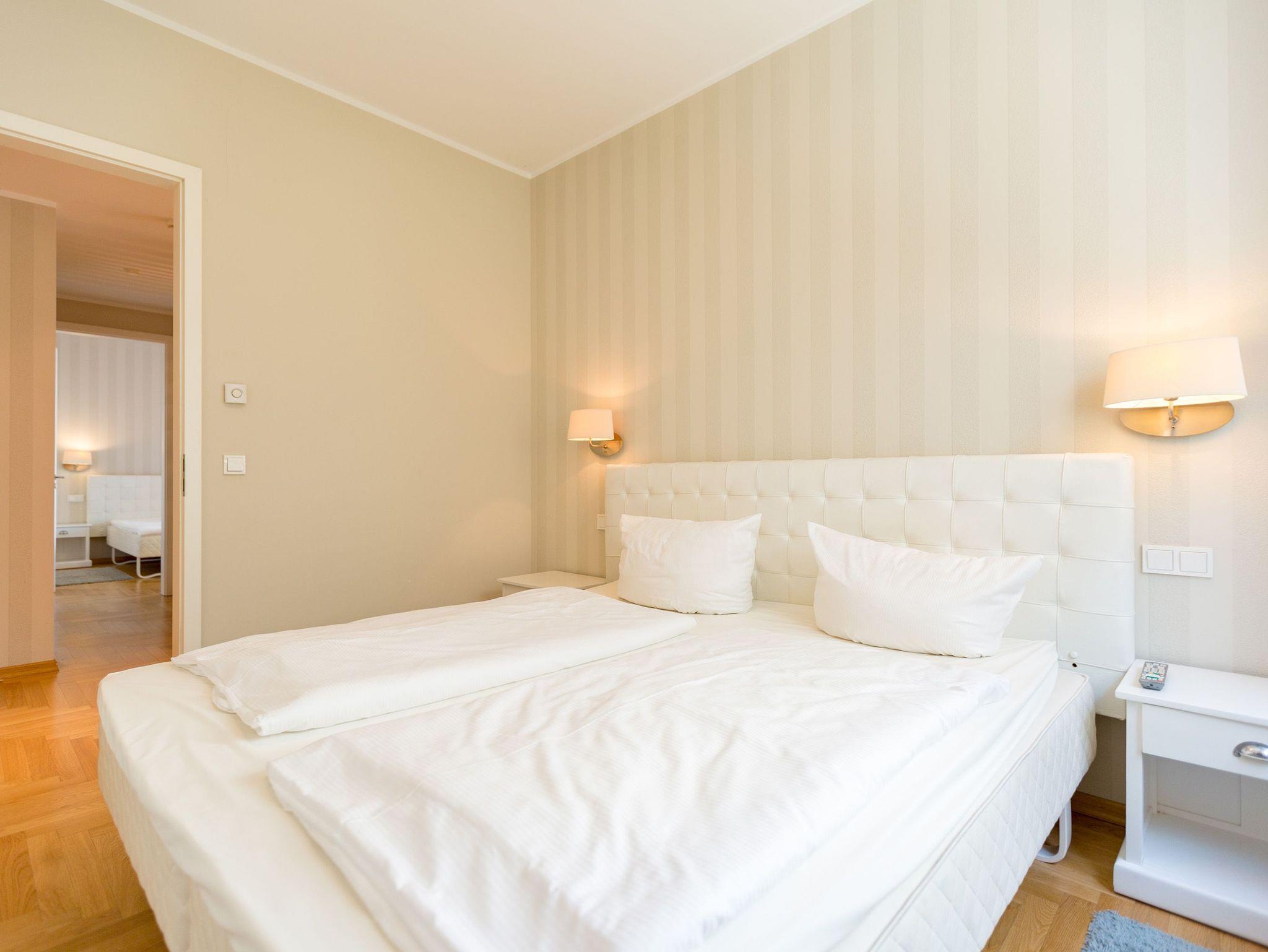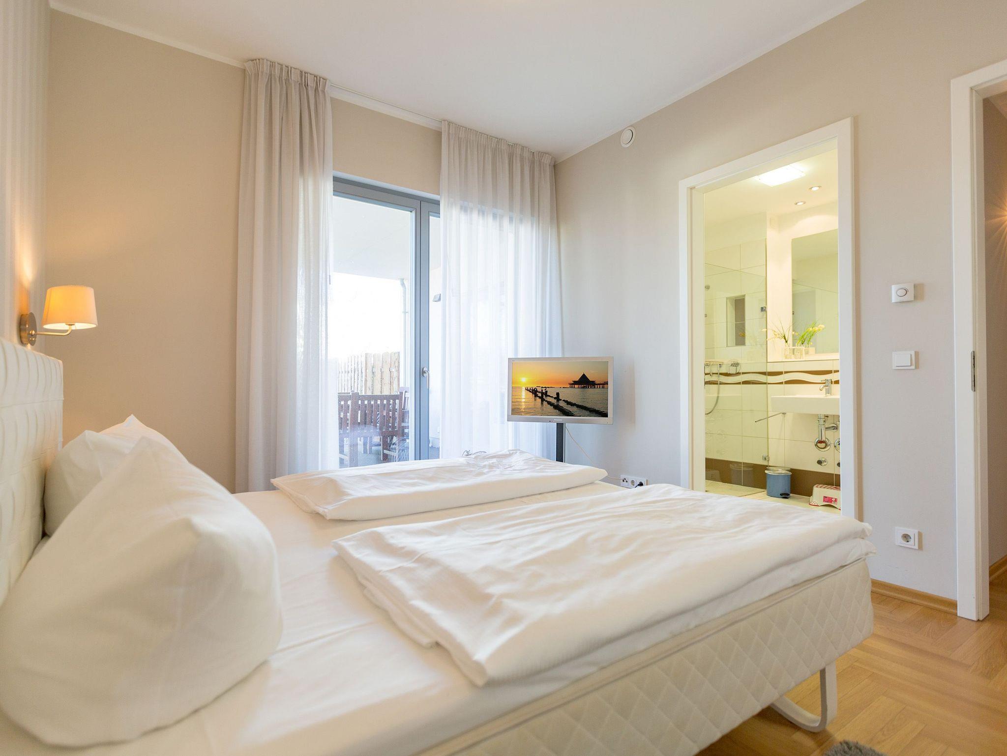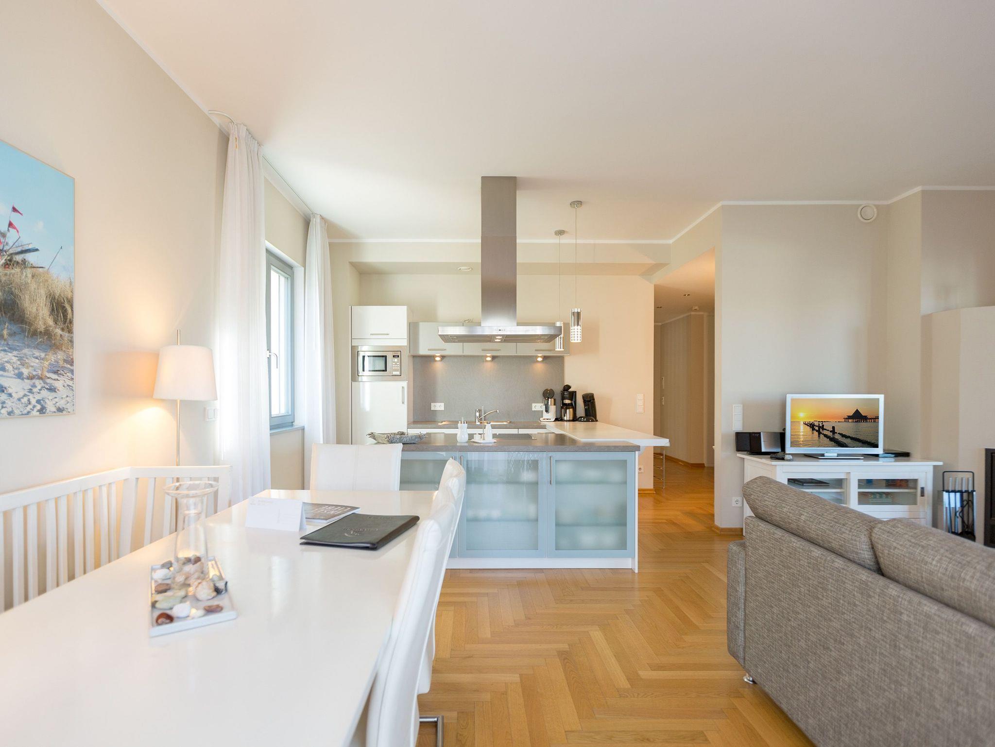 Freuen Sie sich auf ein großzügiges Wohnerlebnis - üppige 98 qm, aufgeteilt auf Wohnbereich mit komplett ausgestatteter Küche, 2 Schlafzimmern mit Doppelbetten und 2 Bäder. Bis zu 4 Personen und ein Kleinkind (bis 3 Jahre) genießen hier die charmante Innenausstattung und die liebevollen Details. Auf Wunsch stellen wir für unsere kleinen Gäste ein Kinderreisebett (ohne zusätzliche Matratze [&] Bettzeug) und einen Kinderhochstuhl ( gegen einen Aufpreis) zur Verfügung. Für Ihren Komfort sind die Betten bei der Anreise bezogen und Handtücher liegen bereit. Das WLAN-Netz im Haus kann kostenfrei genutzt werden. Jeder Raum ist mit edlem Parkett und hellen Tönen eingerichtet, komplettiert durch technische Feinheiten. Ihre eigene Sauna (gegen Gebühr) in der Wohnung und der Kamin wärmen Sie nicht nur an kalten Tagen. In der sonnigen Jahreszeit erweitert sich der Wohnraum durch die große Südwestterrasse mit Bestuhlung. Hier verbringen Sie Ihren Urlaub im dezenten Luxus.