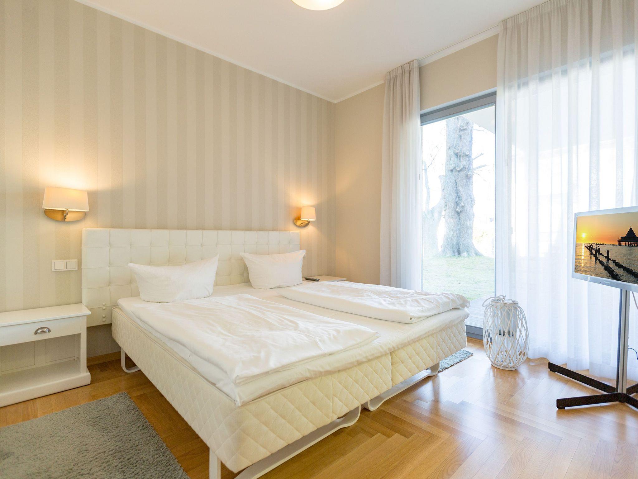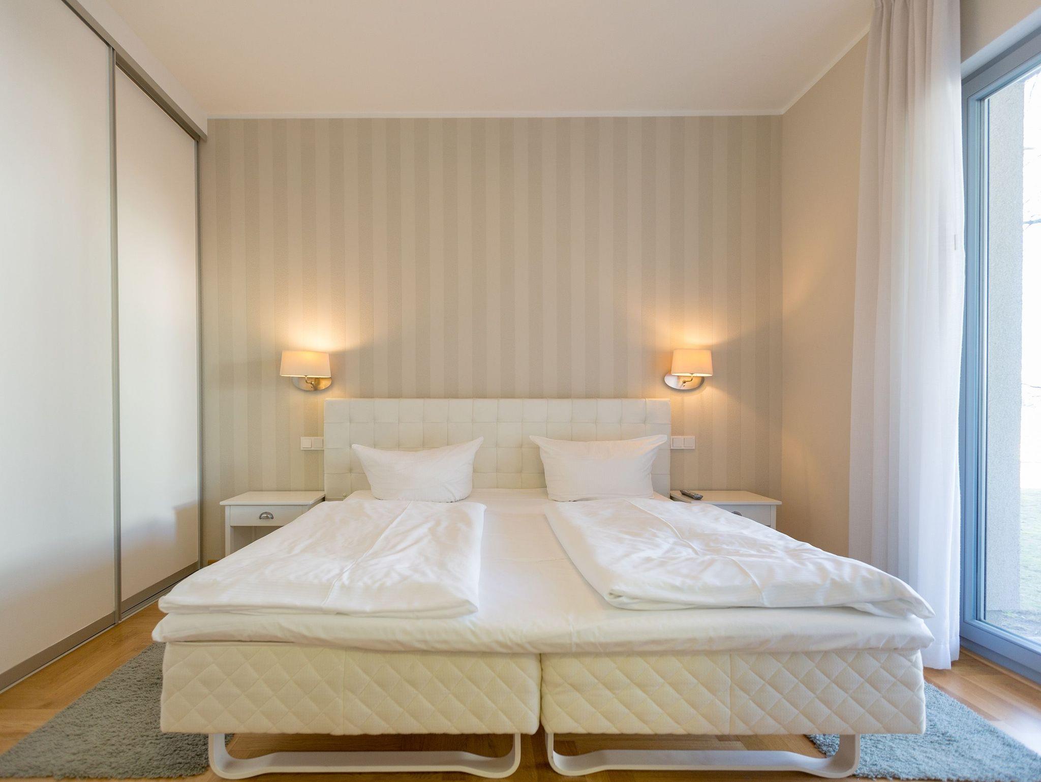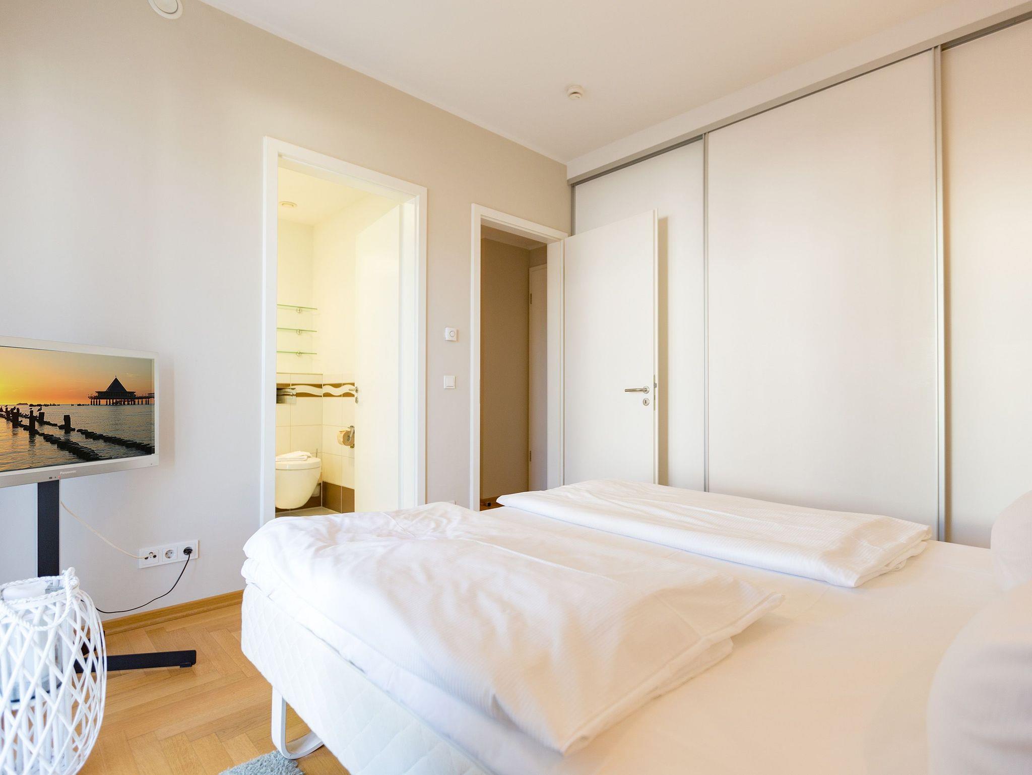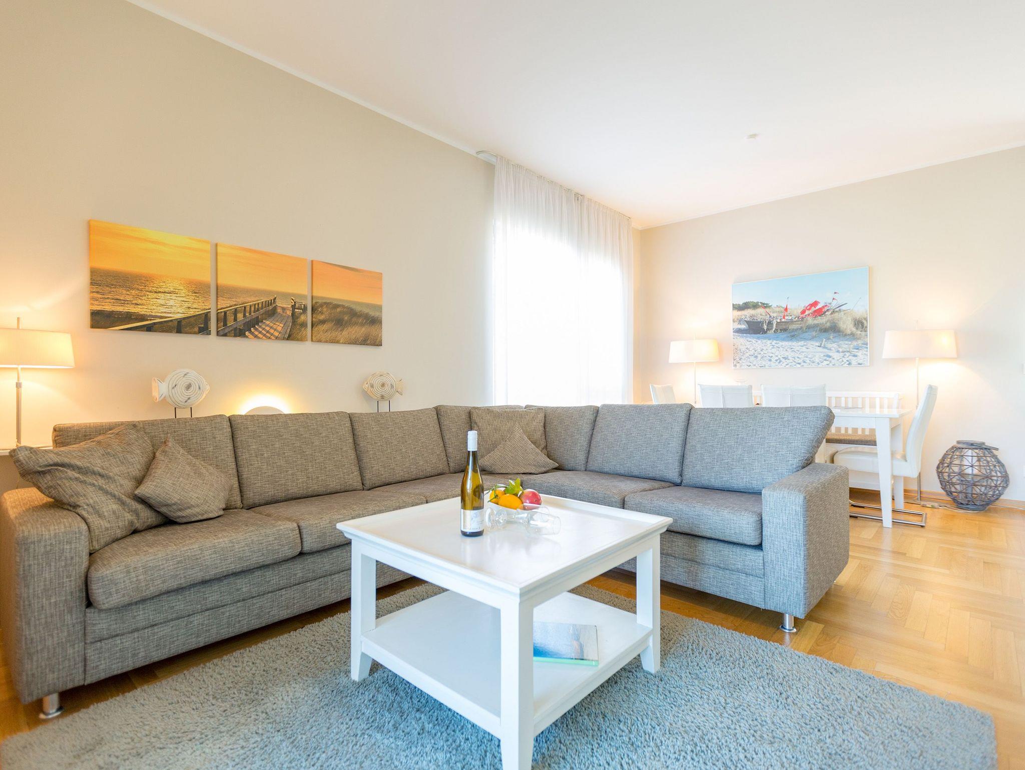 Freuen Sie sich auf ein großzügiges Wohnerlebnis - üppige 98 qm, aufgeteilt auf Wohnbereich mit komplett ausgestatteter Küche, 2 Schlafzimmern mit Doppelbetten und 2 Bäder. Bis zu 4 Personen und ein Kleinkind (bis 3 Jahre) genießen hier die charmante Innenausstattung und die liebevollen Details. Auf Wunsch stellen wir für unsere kleinen Gäste ein Kinderreisebett (ohne zusätzliche Matratze [&] Bettzeug) und einen Kinderhochstuhl ( gegen einen Aufpreis) zur Verfügung. Für Ihren Komfort sind die Betten bei der Anreise bezogen und Handtücher liegen bereit. Das WLAN-Netz im Haus kann kostenfrei genutzt werden. Jeder Raum ist mit edlem Parkett und hellen Tönen eingerichtet, komplettiert durch technische Feinheiten. Ihre eigene Sauna (gegen Gebühr) in der Wohnung und der Kamin wärmen Sie nicht nur an kalten Tagen. In der sonnigen Jahreszeit erweitert sich der Wohnraum durch die große Südwestterrasse mit Bestuhlung. Hier verbringen Sie Ihren Urlaub im dezenten Luxus.