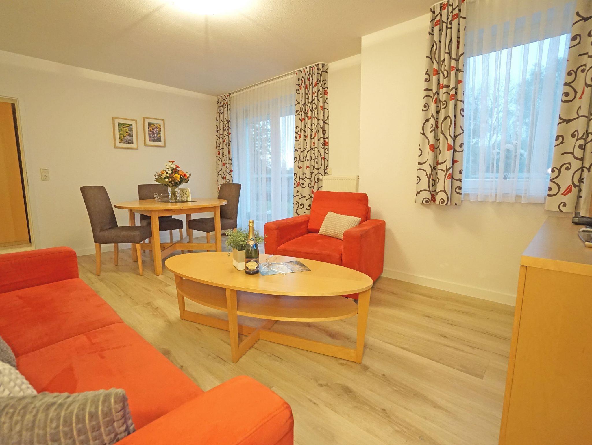 Die geräumige und geschmackvoll eingerichtete Ferienwohnung Nummer 4 in der Villa Madeleine befindet sich im Erdgeschoss mit möblierter Süd-Terrasse. Ein Schlafzimmer ist mit einem Doppelbett (180x200cm) und das zweite mit zwei Einzelbetten ausgestattet. Die separate vollausgestattete Küche lässt keine Wünsche offen. Im komfortablen Wohnzimmer befindet sich die gemütliche Couchgarnitur mit Flachbildfernseher und einem Esstisch. - Ein PKW-Stellplatz und ein Fahrradschuppen stehen auf dem Grundstück zur Verfügung.