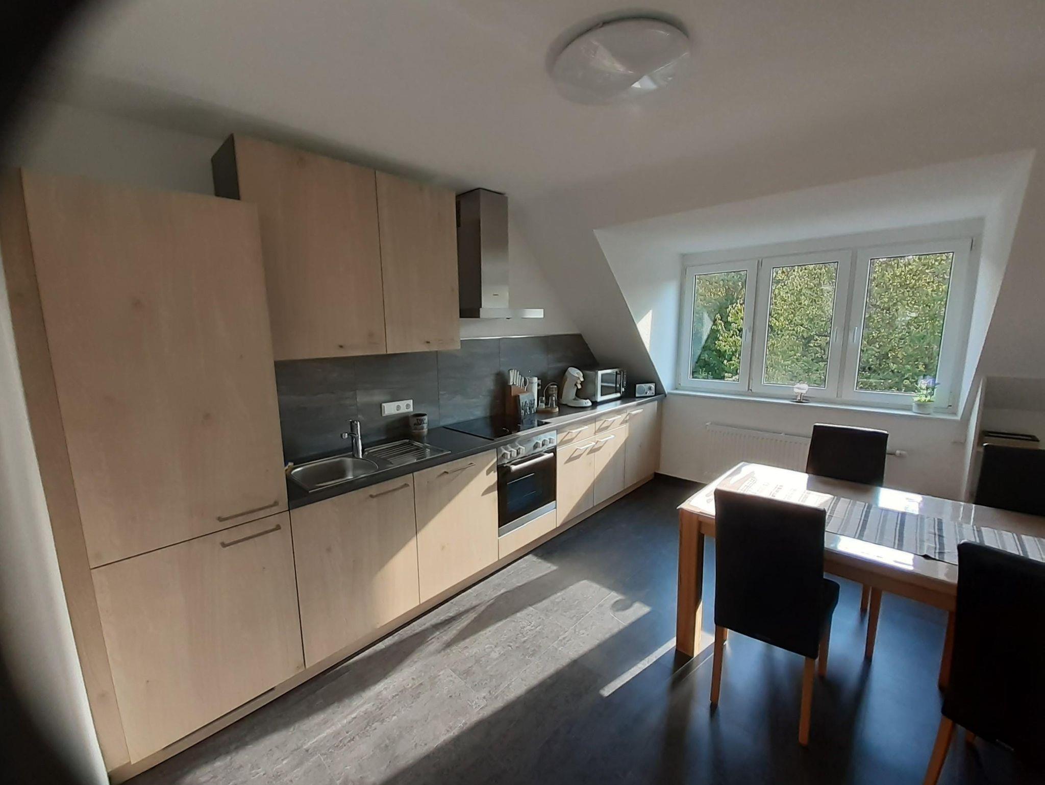 Nebenan befindet sich die gemütliche Küche mit gehobener Ausstattung und Blick ins Grüne auf den Stadtpark.