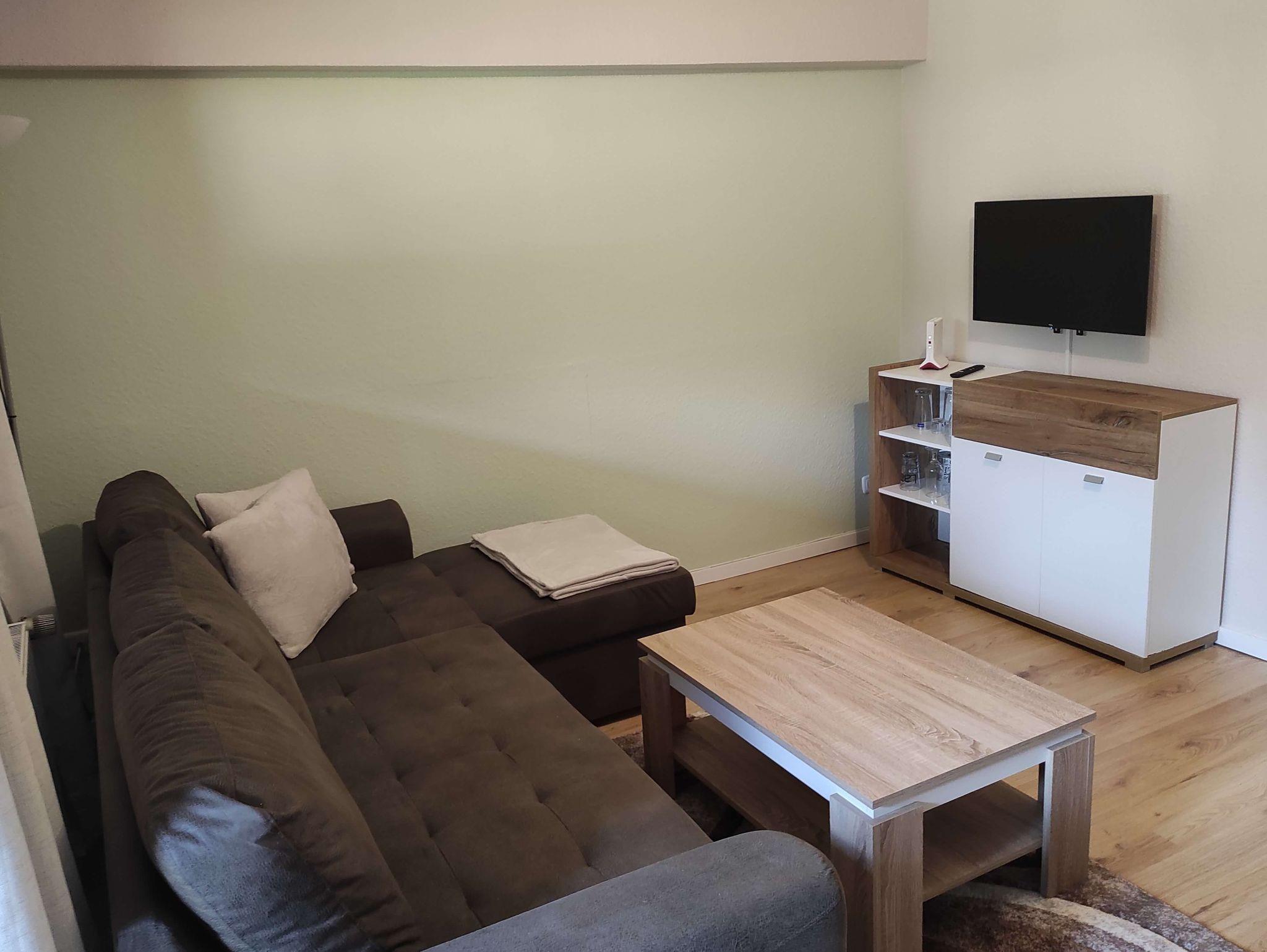 ein Wohn- Esszimmer mit Smart-TV und einer Couch, auf der Sie sich nach einem aktiven Tag erholen können. Auf dieser Couch können auch 2 weitere Personen schlafen.
