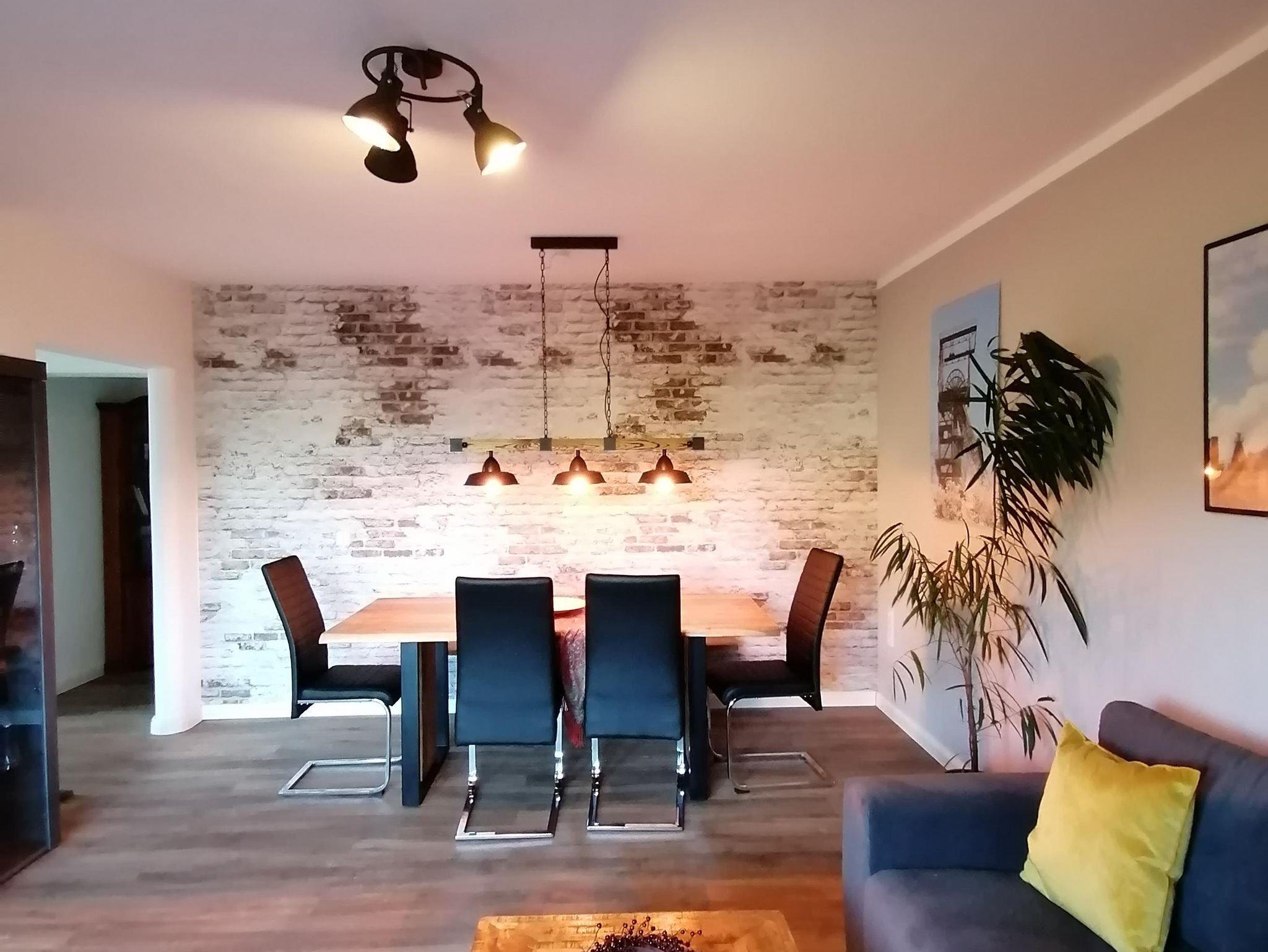 Ca. 80 qm Wohnfläche bieten Platz für 1-5 Personen (notfalls 6). Das Wohnzimmer verfügt über einen großen Esstisch, Schlafsofa, TV und Steroanlage. Die Küche ist mit Geschirrspüler, Kühlschrank inkl. Gefrierfach, Herd, Backofen, Mikrowelle, Wasserkocher, Eierkocher, Toaster und Kaffeemaschine komplett ausgestattet. Ein Schlafzimmer mit Doppelbett und ein kleinerer Schlafraum mit Etagenbett stehen zur Verfügung. Das Badezimmer verfügt über Dusche, Toilette, großen Spiegel und Waschmaschine. Highspeed Wlan und Parkplätze kostenlos. Bitte beachten Sie, dass keine Haustiere erlaubt sind.
