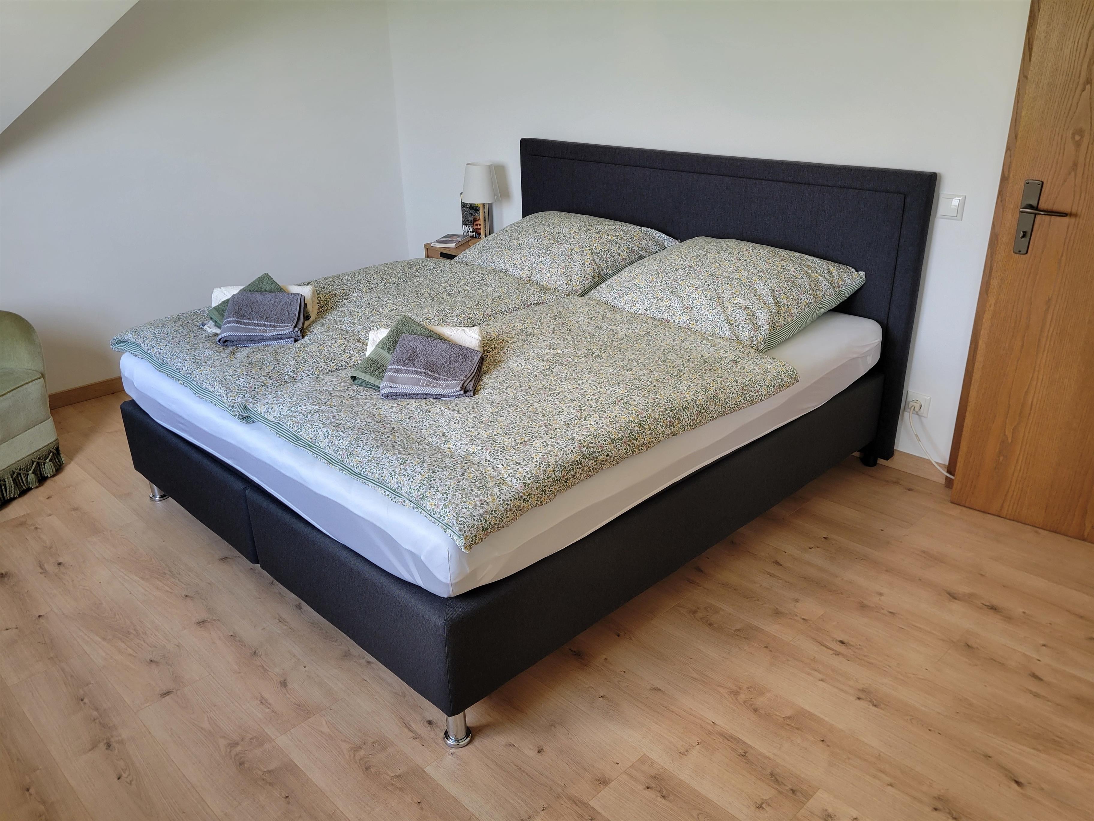 Das Schlafzimmer mit Blick auf den Ort und den Teutoburger Wald und dem Geräusch grasender Pferde lässt Sie ruhig und entspannt schlafen.