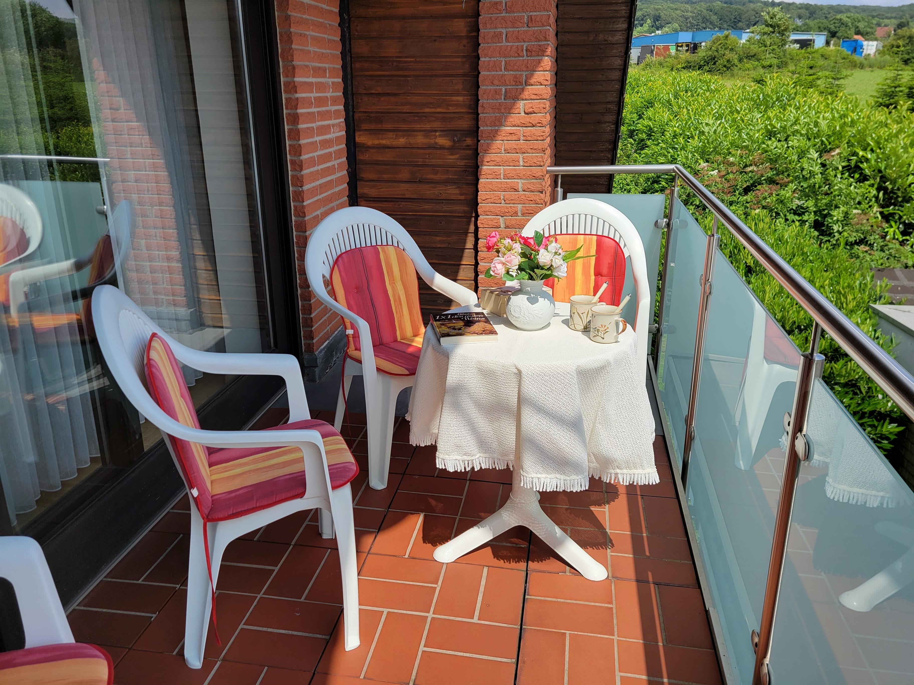 Das Wohnzimmer mit einem großzügigen Balkon ist ein Platz zum Entspannen, klönen und lesen.