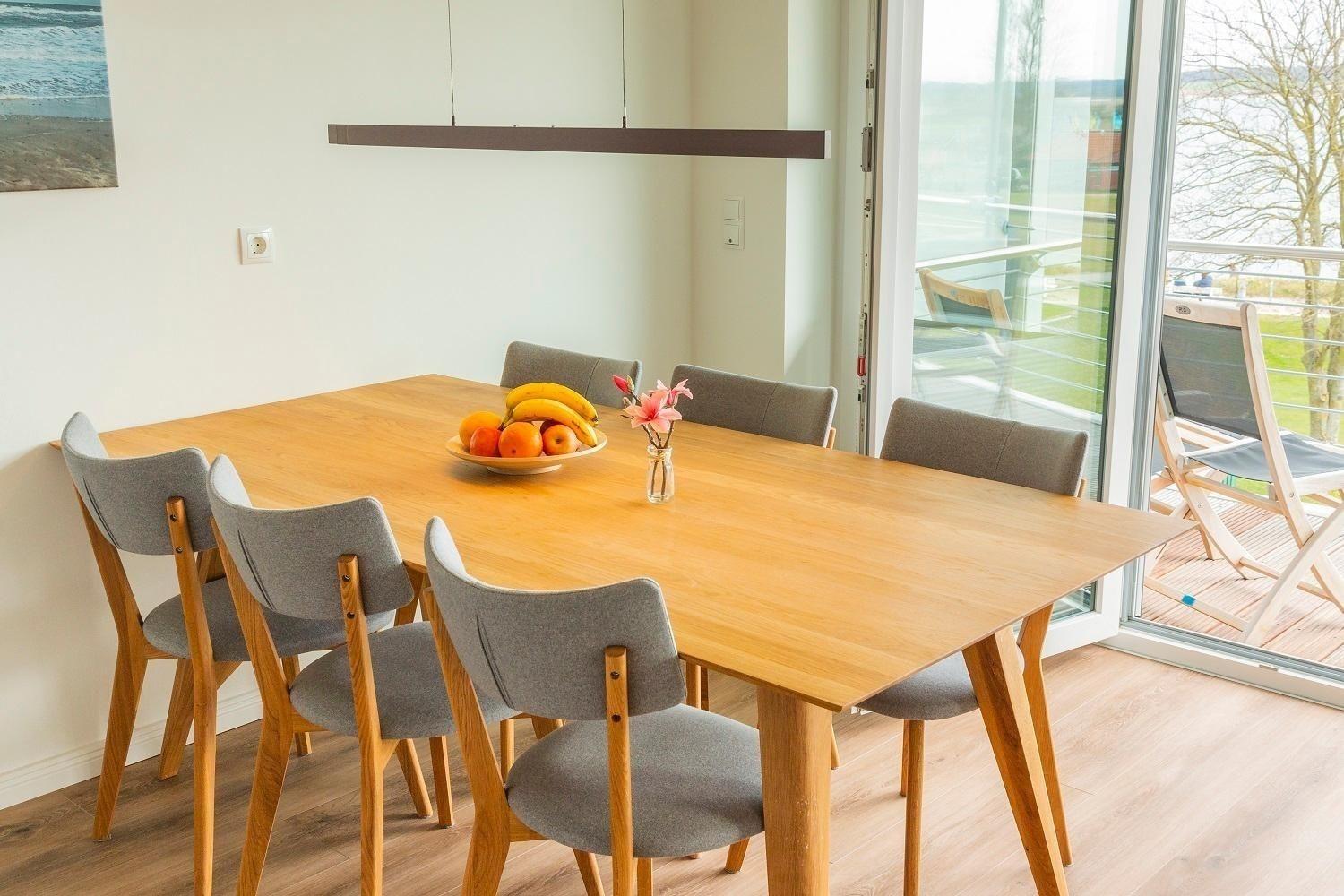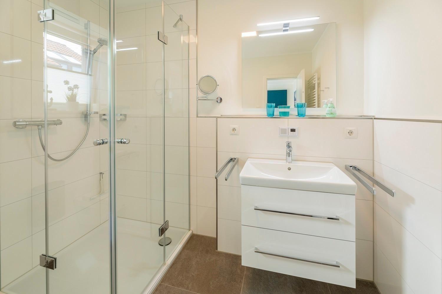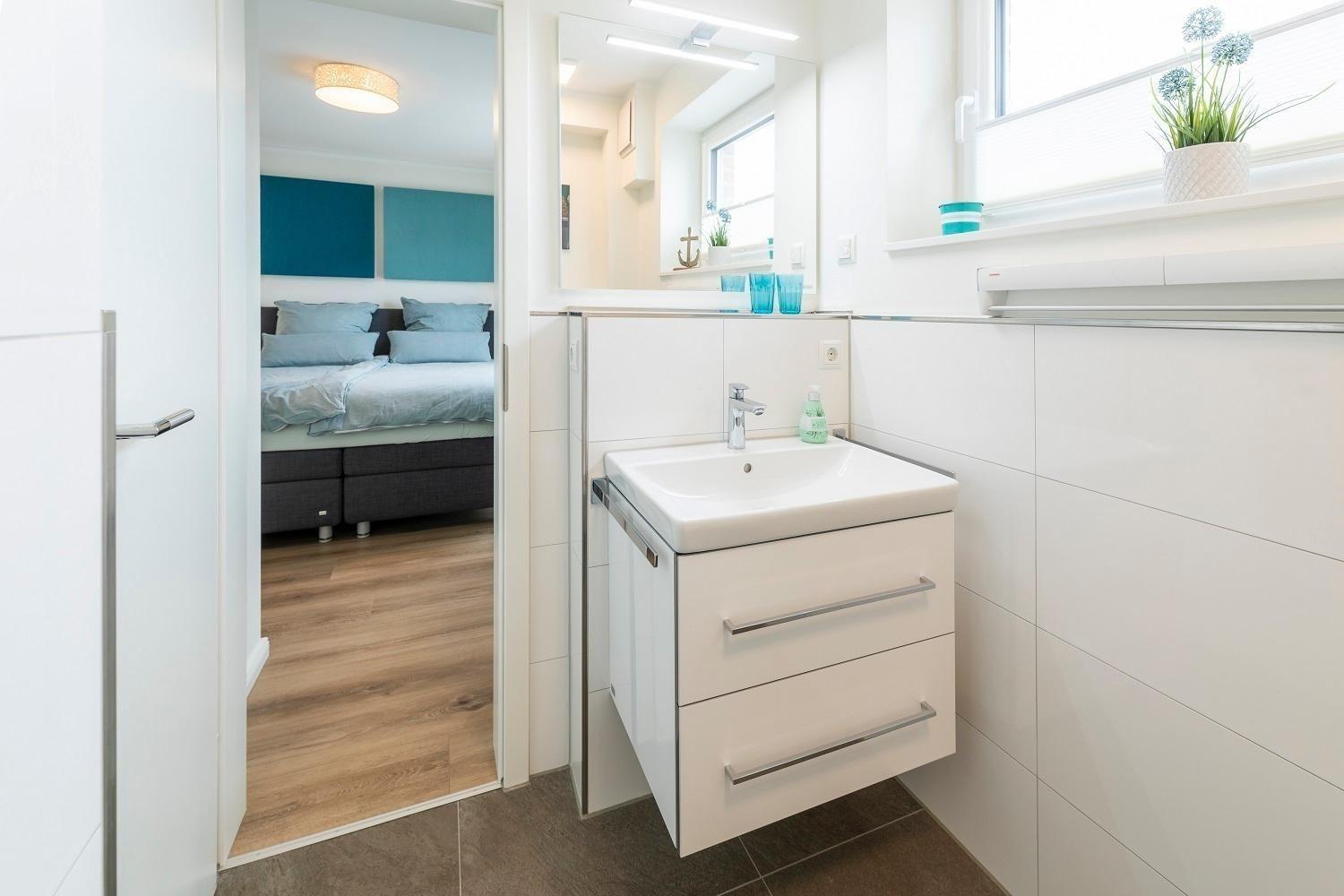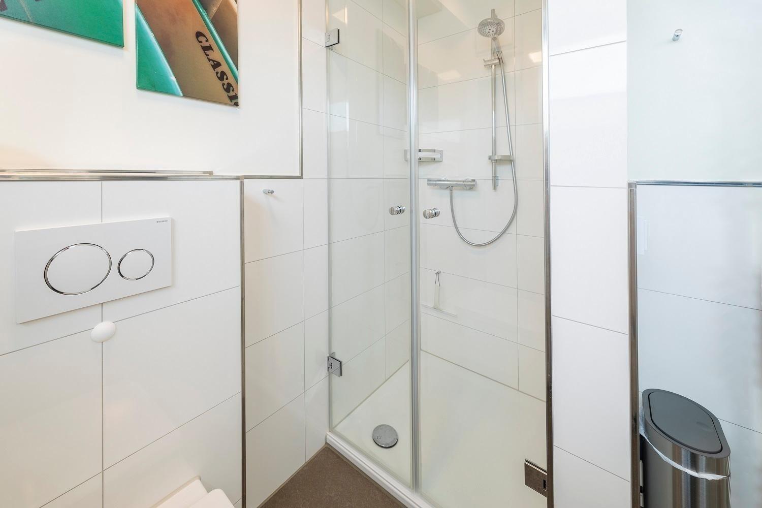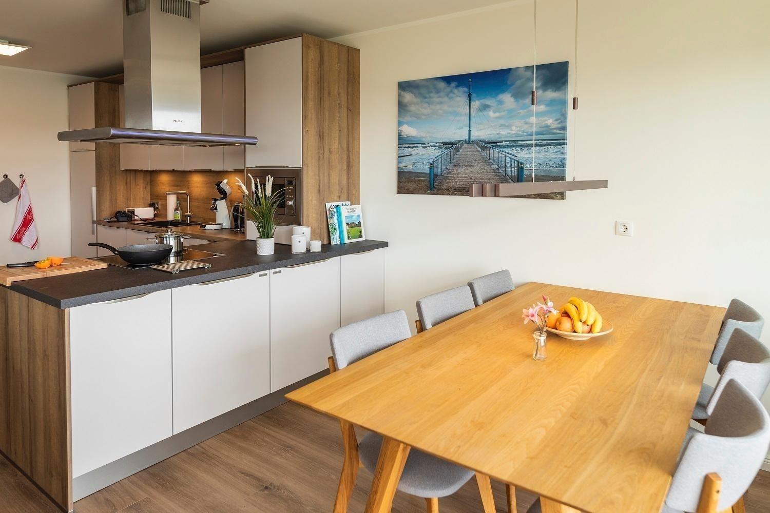 Die Ferienwohnung „Schöne Aussicht“ bietet Platz für vier Personen und beeindruckt mit einem unvergleichlichen Blick auf den weißen Sandstrand und die Ostsee. Der helle Wohnraum mit großer Fensterfront lädt mit einem gemütlichen Sofa, einem Esstisch und einem großen Fernseher zur Entspannung ein. Die offene Küche ist modern gestaltet und vollständig ausgestattet, einschließlich Induktionsherd, Backofen, Kühlschrank mit Gefriervöglichkeit, sowie Geschirrspüler. Zwei Schlafzimmer mit en Suite Duschbädern, Ruf Boxspringbetten und Fernsehern garantieren Komfort. Die bodentiefen Duschen sind mit Glastüren versehen und bieten moderne Annehmlichkeiten wie Handtuchwärmer. WLAN ist verfügbar, und eine Sauna ergänzt das Angebot. Ein Fahrstuhl im Haus sowie ein eigener Stellplatz sorgen für zusätzlichen Komfort.