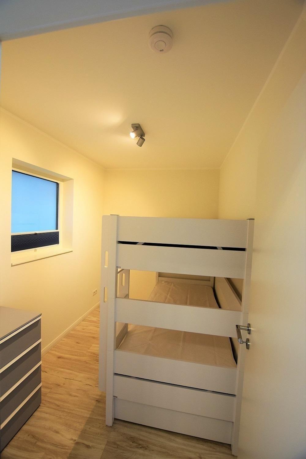 Die Ferienwohnung „Strandperle“ befindet sich im 2. Stock und bietet auf 52 m² eine hochwertige Innenausstattung mit Fußbodenheizung und bodentiefen Fenstern. Der offene Wohn- und Essbereich ermöglicht den Blick aufs Meer und verfügt über eine großzügige Wohnlandschaft sowie einen großen Flachbild-Fernseher. Die moderne Küche ist komplett ausgestattet mit Spülmaschine, Waschmaschine, Ceranherd, Backofen, Kühlschrank mit Gefriermöglichkeit, Kaffeemaschine, Wasserkocher und Toaster. Zwei Schlafzimmer bieten Platz für bis zu vier Personen: ein großes Schlafzimmer mit Doppelbett (180x200 cm) und ein Kinderzimmer mit Etagenbett (80x200 cm). Das helle Badezimmer ist mit einer bodentiefen Dusche ausgestattet. WLAN und ein Internetanschluss sind kostenfrei verfügbar. Ein Fahrstuhl erleichtert den Zugang zur Wohnung, und es besteht die Möglichkeit zur Nutzung eines gemeinschaftlichen Fahrradabstellplatzes.