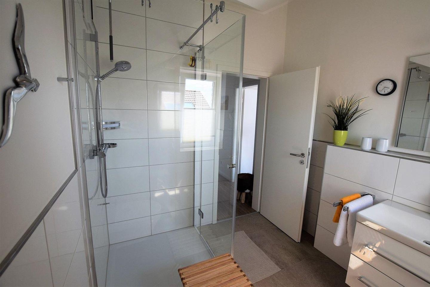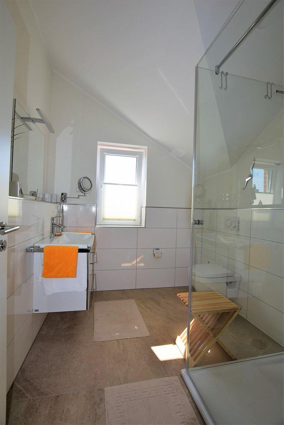 Das Badezimmer der Unterkunft ist ebenso ansprechend gestaltet wie die übrigen Räume. Geräumig angelegt und mit einem Tageslichtfenster versehen bietet es Ihnen zudem reichlich Komfort. Eine bodentiefe Dusche mit Glaskabine, ein großer Spiegel, ein schöner Waschtisch und das WC gehören ebenso wie Deckenspots und ein Handtuchwärmer zu den Annehmlichkeiten des Badezimmers. Ein beleuchteter Kosmetikspiegel rundet die Ausstattung ab.Helle Fliesen unterstreichen den modernen Stil des Raumes, welcher sich hervorragend in die Wohnräume der Unterkunft Deck 44 einpasst.