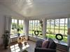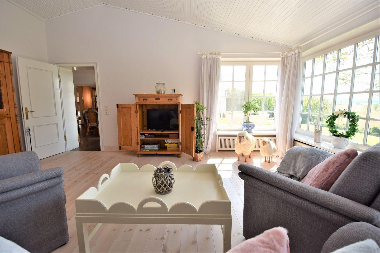 Der Wohnbereich des Ferienhauses beeindruckt mit seinen traumhaften Sprossenfenstern, die den Raum mit viel Tageslicht durchfluten und einen malerischen Ausblick auf die umliegende Natur bieten. Hier können die Gäste gemütliche Abende verbringen und den Charme dieses einzigartigen Hauses erleben, das durch seine Schönheit verzaubert.