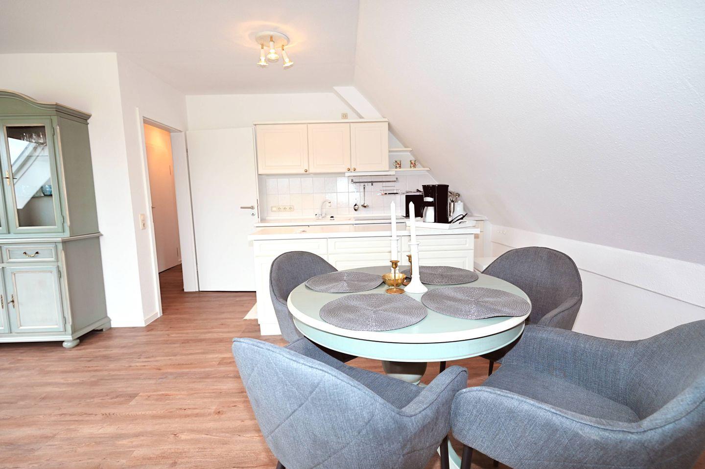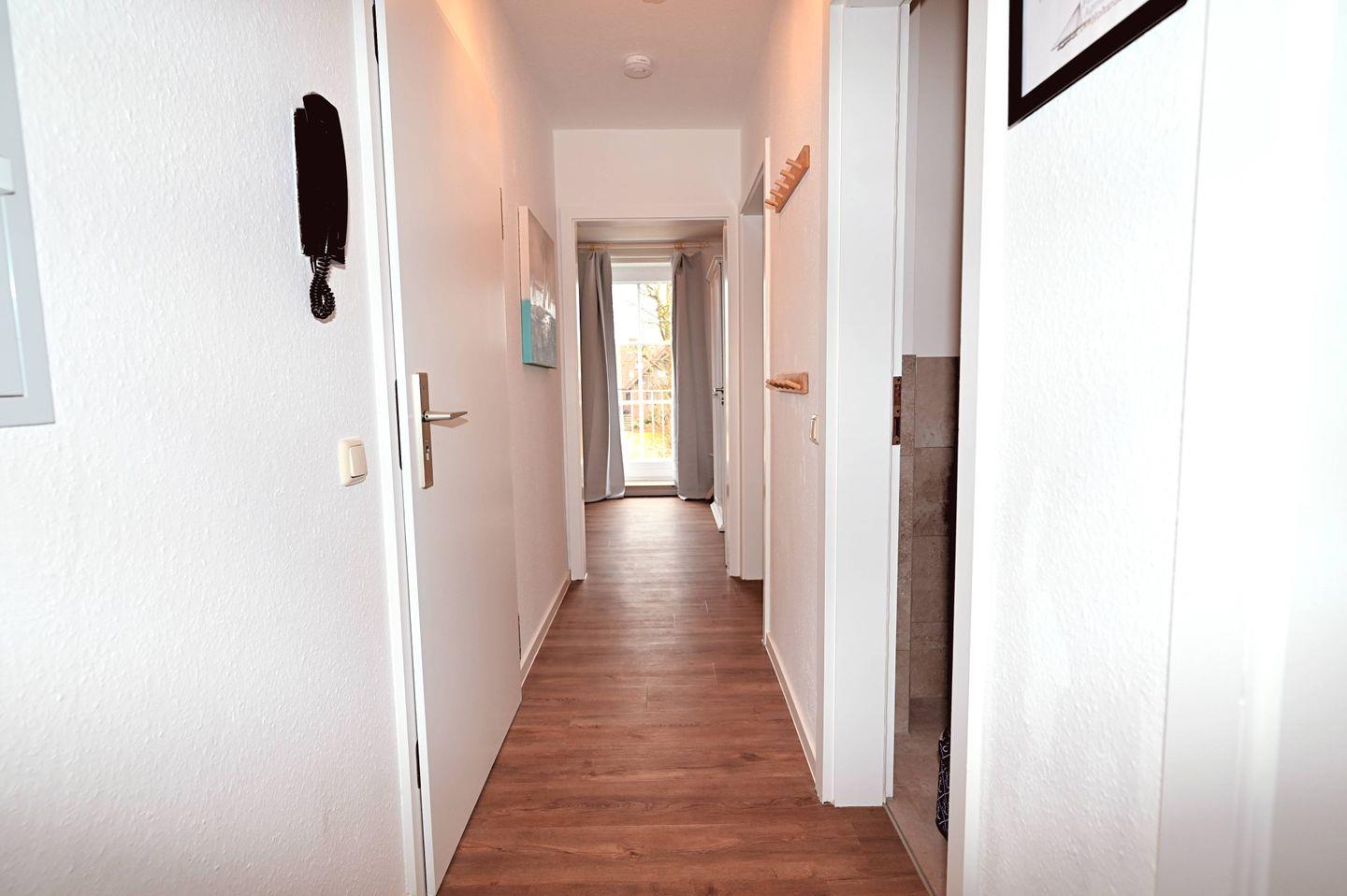 Die 3-Zimmer-Ferienwohnung ist für 4 Personen ausgelegt. Sie besteht aus einem offenen Wohn- und Essbereich mit integrierter Küche, die bestens ausgestattet ist: Backofen, Mikrowelle, Kühlschrank mit Gefrierfach, Kaffeemaschine, Wasserkocher, Toaster und Herd. Der Wohnbereich lädt mit einem gemütlichen Sofa und einem bequemen Sessel auch in den Abendstunden zum Verweilen ein. Beide Schlafzimmer verfügen über ein komfortables Doppelbett mit geräumigem Kleiderschrank und Nachttischlampen. Die Fenster in den Schlafzimmern lassen sich durch Verdunkelungsgardinen verdunkeln, sodass Sie in Ruhe ausschlafen können.