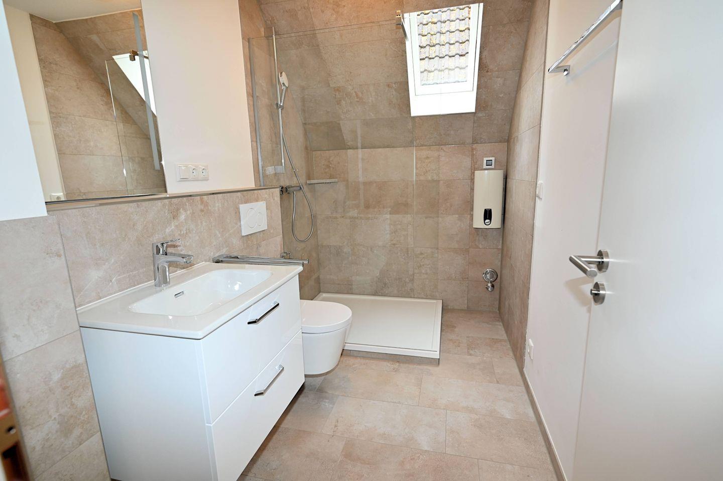 Das moderne Badezimmer bietet Ihnen eine ebenerdige Regendusche, WC, großen Spiegel, Föhn und ein Veluxfenster, das Tageslicht in den Raum lässt. Die großzügigen Schubladen unter dem Waschbecken bieten viel Stauraum für Kosmetik- und Pflegeprodukte.