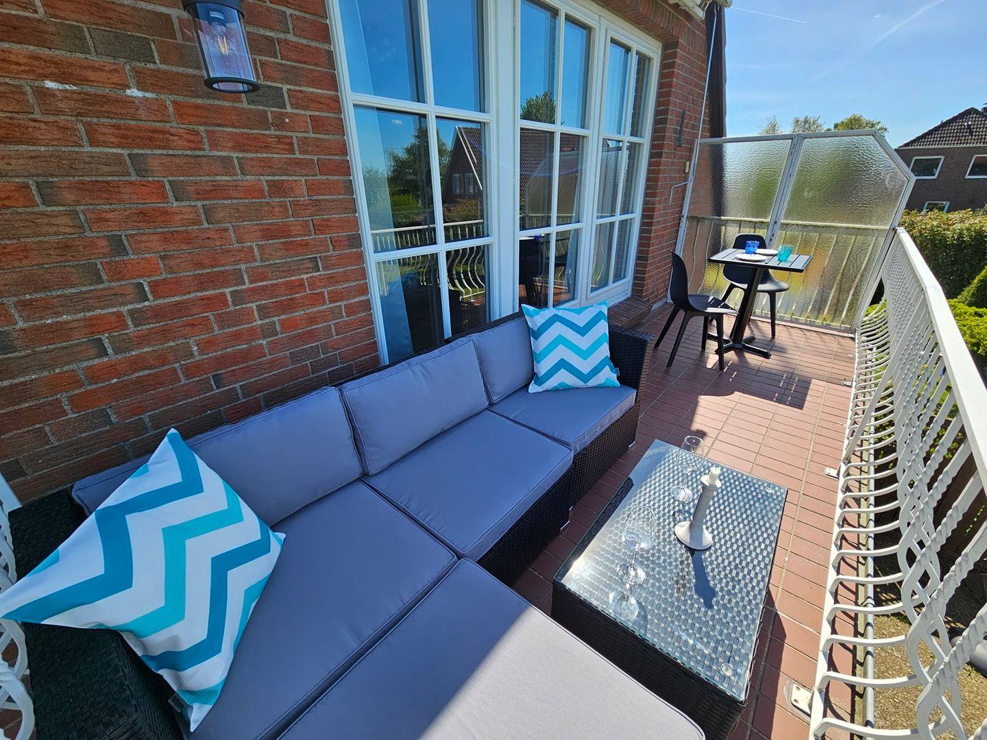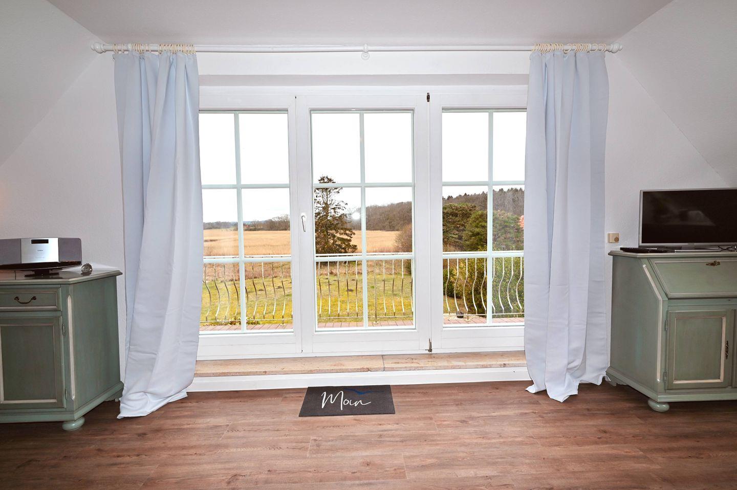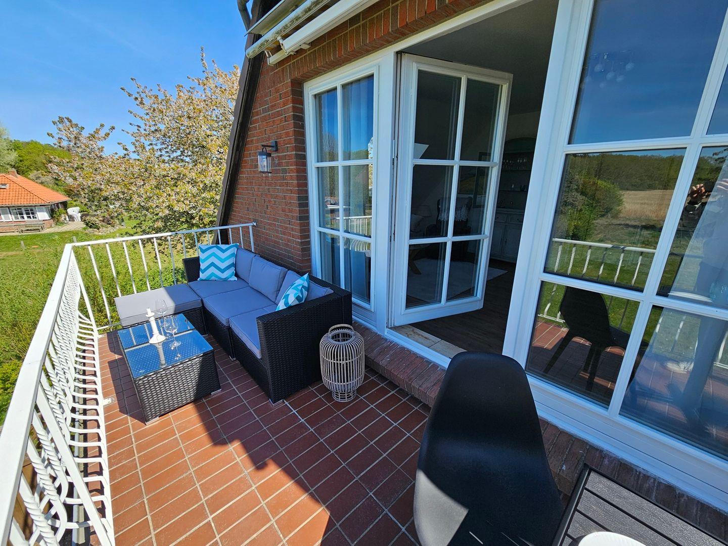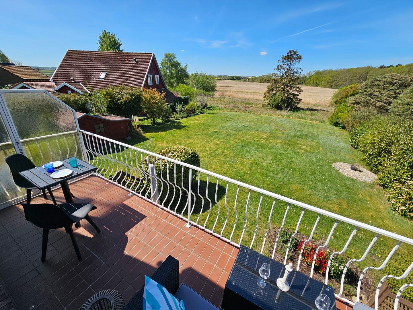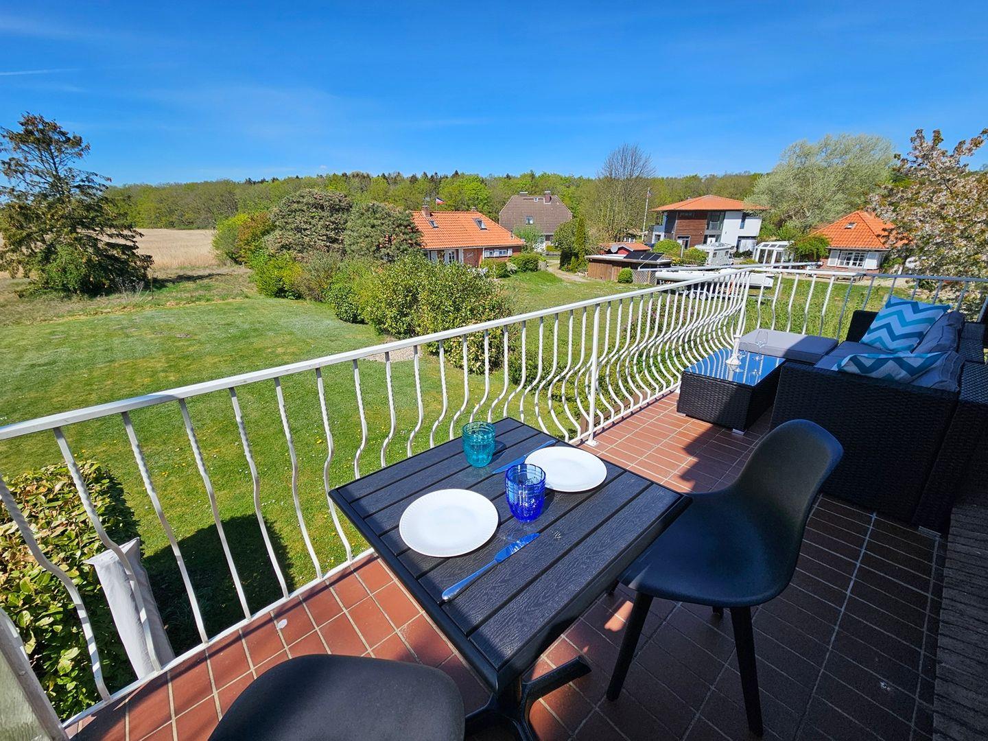 Moderne Ferienwohnung in Hohwacht mit Balkon und direktem Blick auf Salzwiesen und Wald.