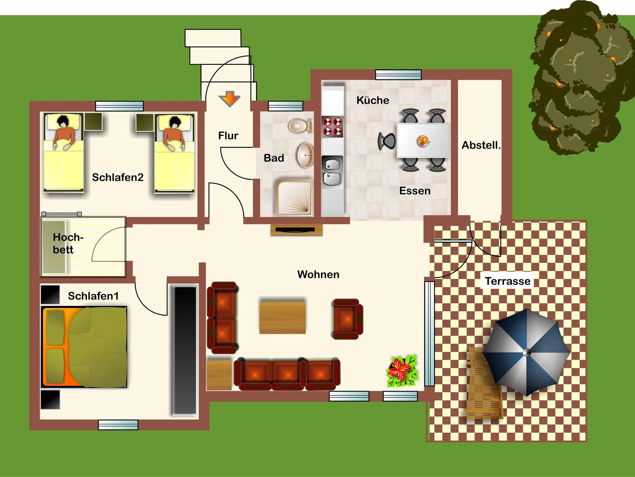 Vom Eingangsbereich (Flur) gelangt man in das Badzimmer (Dusche/WC) und den Wohnraum (Zugang zur möblierten Terrasse und dem außenliegenden Abstellraum. Das Ferienhaus bietet Ihnen einen Schlafraum mit einem Doppelbett, einen Schlafraum mit einem eingebauten Hochbett und 2 Einzelbetten, ein Badezimmer (Dusche/WC), ein geräumiges Wohnzimmer mit offener Küche (4-Plattenherd/ Backofen, Kühlschrank/Gefrierfach) und Essplatz. Zugang zur möblierten Terrasse vom Wohnzimmer. Nichtraucherhaus - kostenloses WLAN - Haustiere nicht erlaubt - Brötchenservice von Ostern bis Oktober!