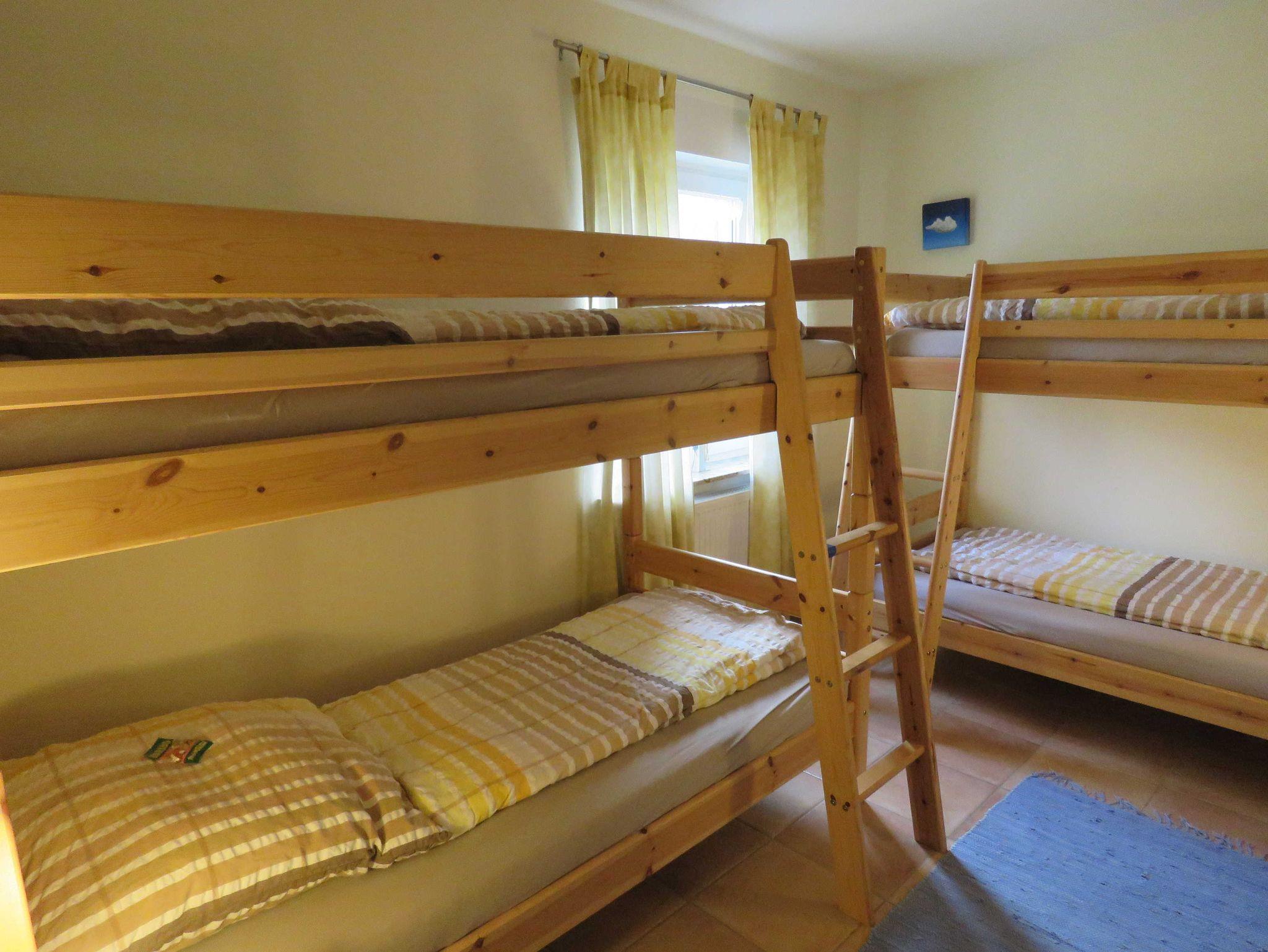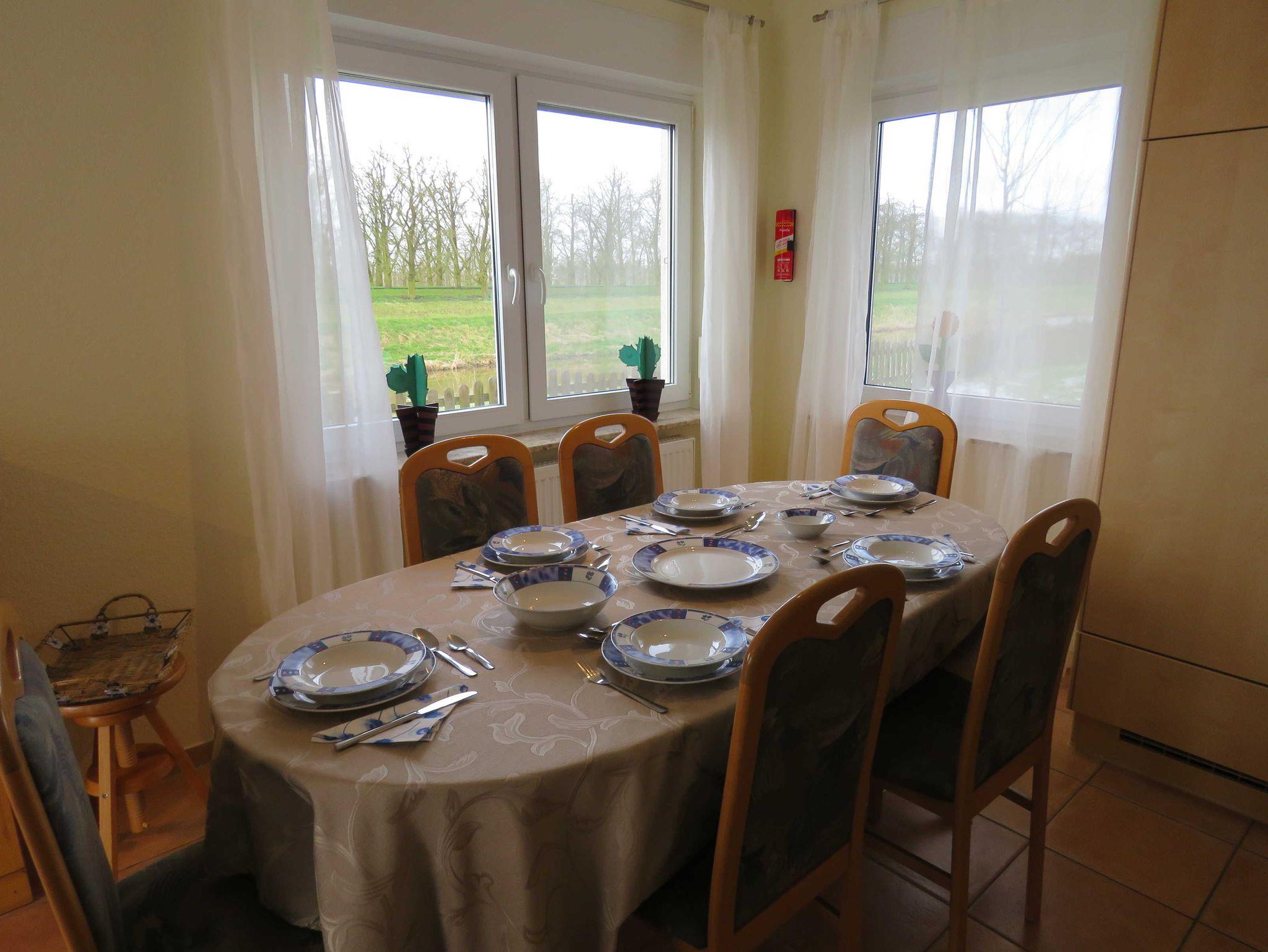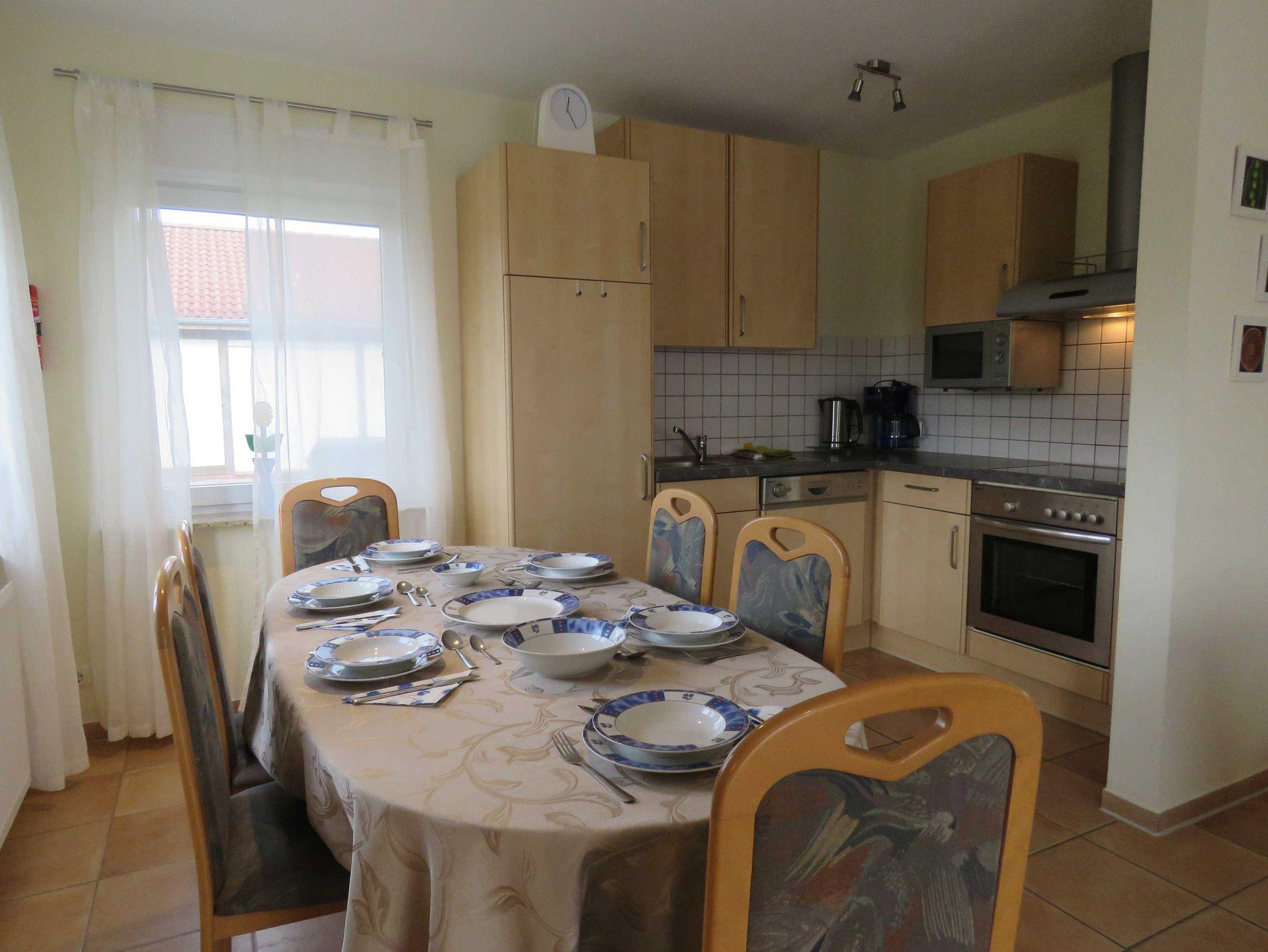Das massiv errichtete, ebenerdige Ferienhaus 323, vom Typ Kogge, befindet sich im absolut autofreien Teil unseres schönen Feriendorfes - ruhige Randlage mit Blick auf die Wettern und einen alten Obsthof. Das Haus verfügt über ca. 60 m² Wohn-/Nutzfläche und kann mit bis zu 6 Personen (+1 Kleinkind im Kinderreisebett) belegt werden. Das Ferienhaus bietet Ihnen neben einem Schlafraum mit einem Doppelbett, einem Schlafraum mit 2 Doppelstock-/Etagenbetten, einem Badezimmer (Dusche / WC), einem Gäste-WC und einem innenliegenden Abstellraum (mit Waschmaschine und Trockner) ein geräumiges Wohnzimmer mit offener Küche (Ceran-Kochfeld/Backofen, Kühlschrank/Gefrierfach, Mikrowelle, Spülmaschine) und Essplatz. Zugang zur möblierten Terrasse vom Wohnzimmer. Für den Gepäcktransport steht im Abstellraum oder dem zum Haus gehörenden Gartenhäuschen, in dem man seine Fahrräder unterstellen kann, ein Kofferwagen zur Verfügung. Nichtraucherhaus - kostenloses WLAN - Haustiere erlaubt - Brötchenservice von Ostern bis Oktober!