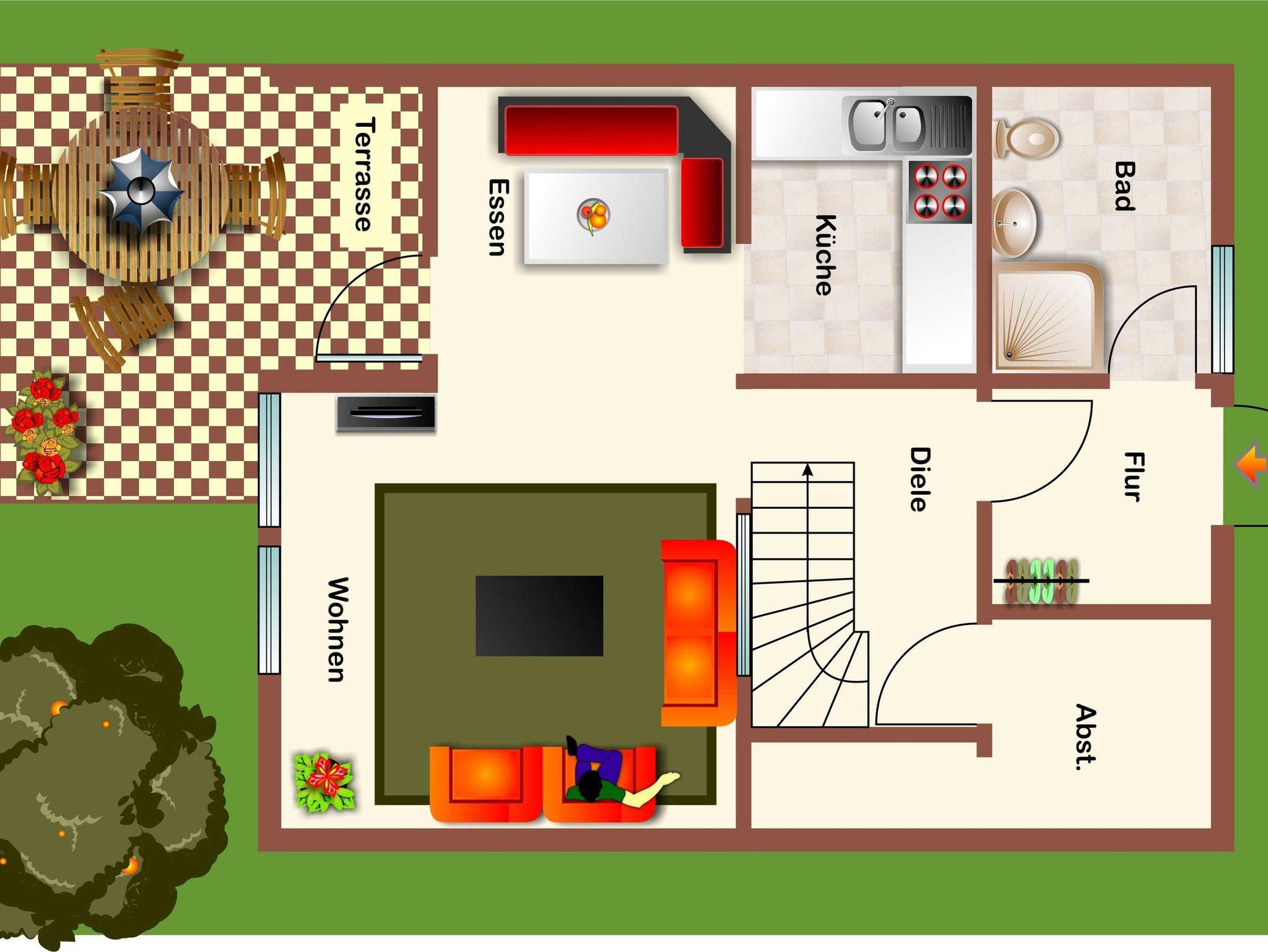 Die Nurdach-Ferienhäuser vom Typ Lederstrumpf verfügen über eine Wohn-/Nutzfläche von ca. 66 m² und können mit bis zu 6 Personen belegt werden (+ 1 Kleinkind im Kinderreisebett). Im Erdgeschoss befindet sich das Badezimmer (Dusche/WC), der innenliegende Abstellraum, die Küche (Ceran-Kochfeld/Backofen,Kühlschrank/Gefrierfach, Mikrowelle und Spülmaschine) und der Wohnraum (Zugang zur möblierten Terrasse) mit Schlafcouch und angrenzender Essecke. Im Obergeschoss befinden sich zwei Schlafräume mit jeweils zwei Einzelbetten. Nichtraucherhaus - kostenloses WLAN - Haustiere erlaubt - Brötchenservice von Ostern bis Oktober!