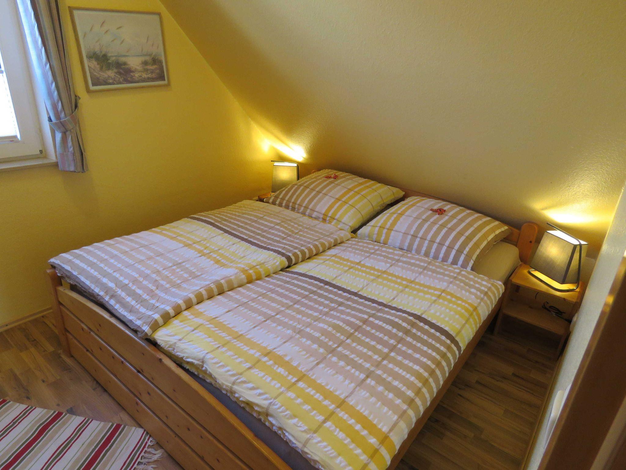 Das massiv errichtete Ferienhaus 122, vom Typ Scout 60, verfügt über ca. 60 m² Wohn-/Nutzfläche auf 2 Etagen und kann mit bis zu 5 Personen (+ 1 Kleinkind im Kinderbett) belegt werden. Im Erdgeschoss befindet sich das Badezimmer (Dusche/WC), das Wohnzimmer (mit Kojenbett) mit angrenzender offener Küche mit Essplatz (Ceran-Kochfeld/Backofen - Kühlschrank/Gefrierfach, Mikrowelle und Spülmaschine). Zugang zur möblierten Terrasse vom Wohnzimmer. Über die offene Treppe im Wohnbereich gelangt man zu den beiden Schlafräumen (ein Schlafraum mit einem Doppelbett und einem Kinderbett und ein Schafraum mit zwei Einzelbetten) im Obergeschoss. Das zum Haus gehörende Gartenhäuschen bietet Abstellmöglichkeit für Fahrräder etc. Nichtraucherhaus - kostenloses WLAN - Haustiere erlaubt - Brötchenservice von Ostern bis Oktober!