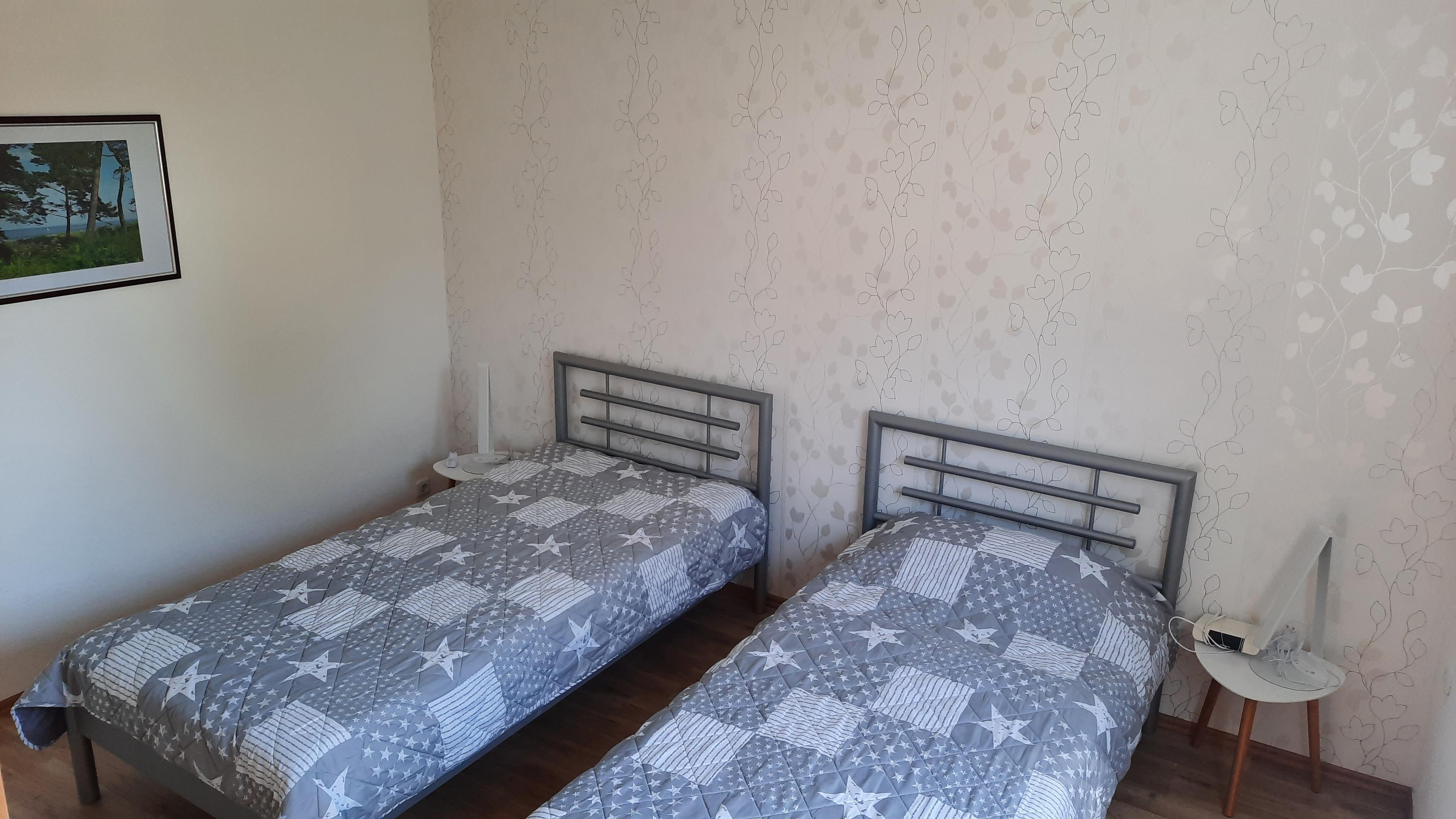 Die Ferienwohnung verfügt über zwei geräumige Schlafzimmer für vier Personen (ein Doppelbett und zwei Einzelbetten) und einen Hauptraum. Dieser unterteilt sich in einen Koch-/Essbereich mit vollwertiger Einbauküche und einen Wohnbereich mit bequemer Sitzecke und Fernseher. Die Wohnung ist ebenerdig und hat einen großen Vorflur. Für Fahrräder steht je Ferienwohnung ein separater abschließbarer Abstellraum zur Verfügung.