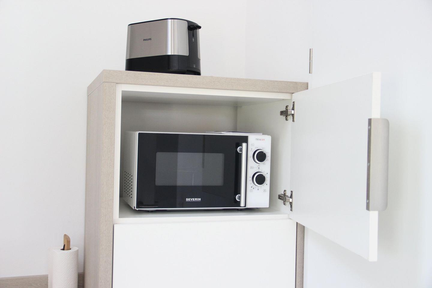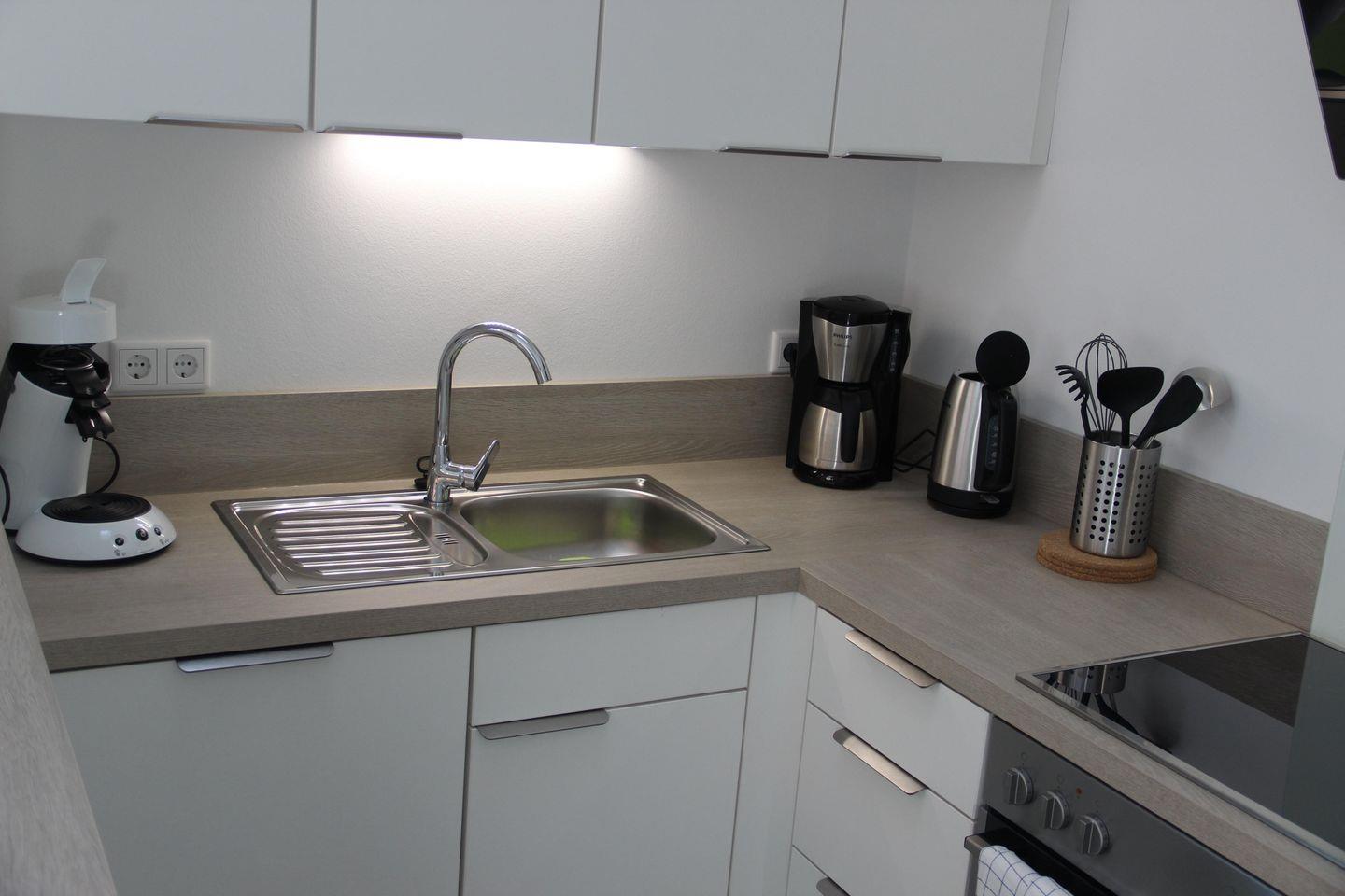 Die Küche lässt keine Wünsche offen, sie ist mit modernen Geräten wie z. B. Mikrowelle, Ceran-Kochfeld mit Backofen, Kaffeemaschine, Spülmaschine und anderen kleinen Helfern ausgestattet.
