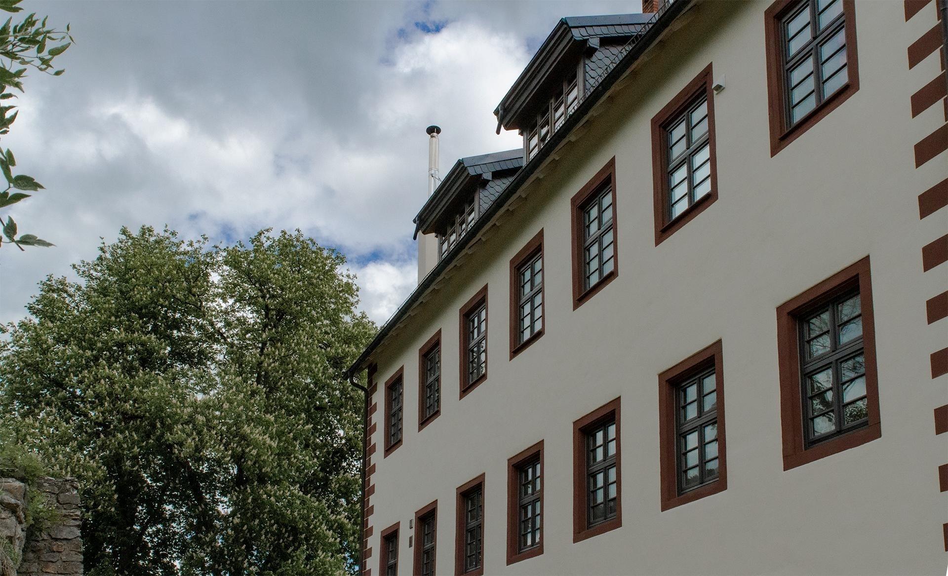 Im Ortskern von Mühlen gelegen, überblickt man von dem auf einer Sockelmauer stehenden Schloss den gesamten Ort Mühlen.