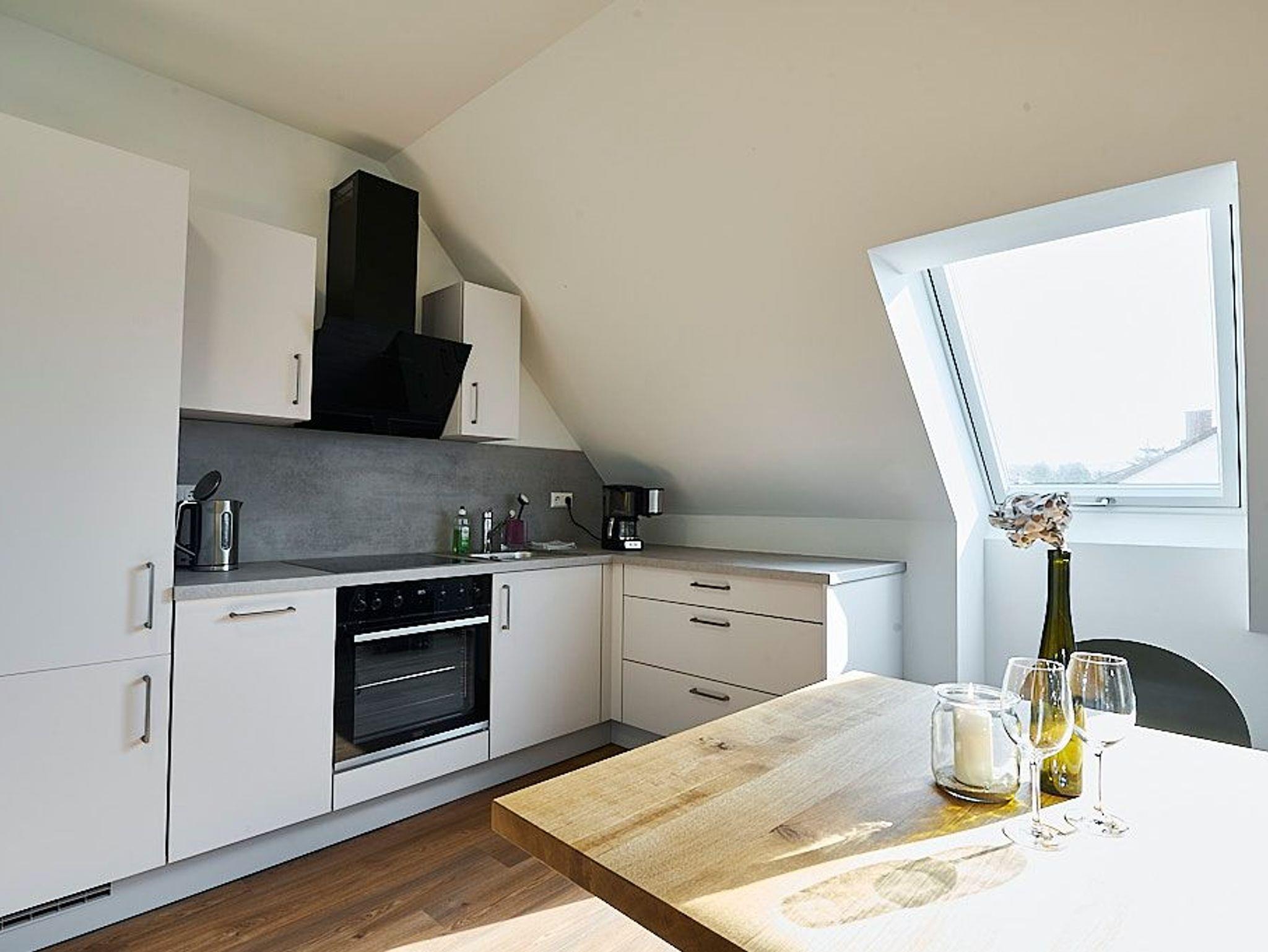 Wohnzimmer mit Couch und separatem Schlafsofa, Schlafzimmer mit Doppelbett und Kleiderschrank, Badzimmer mit Dusche, voll ausgestattete Küche (Spülmaschine, Wasserkocher, Kaffeemaschine, Kühlschrank uvm., Essbereich mit Tisch und 2 Stühlen)