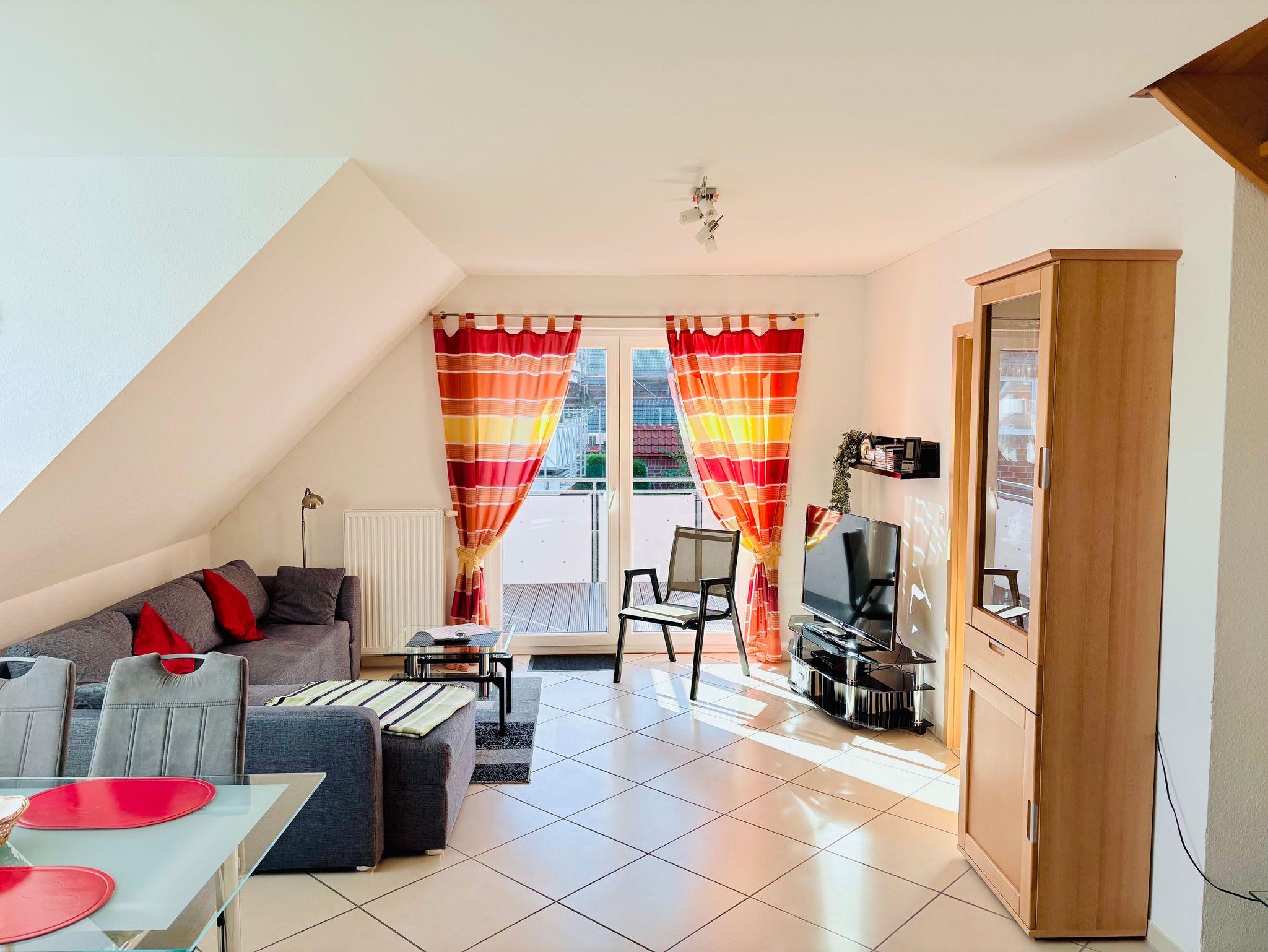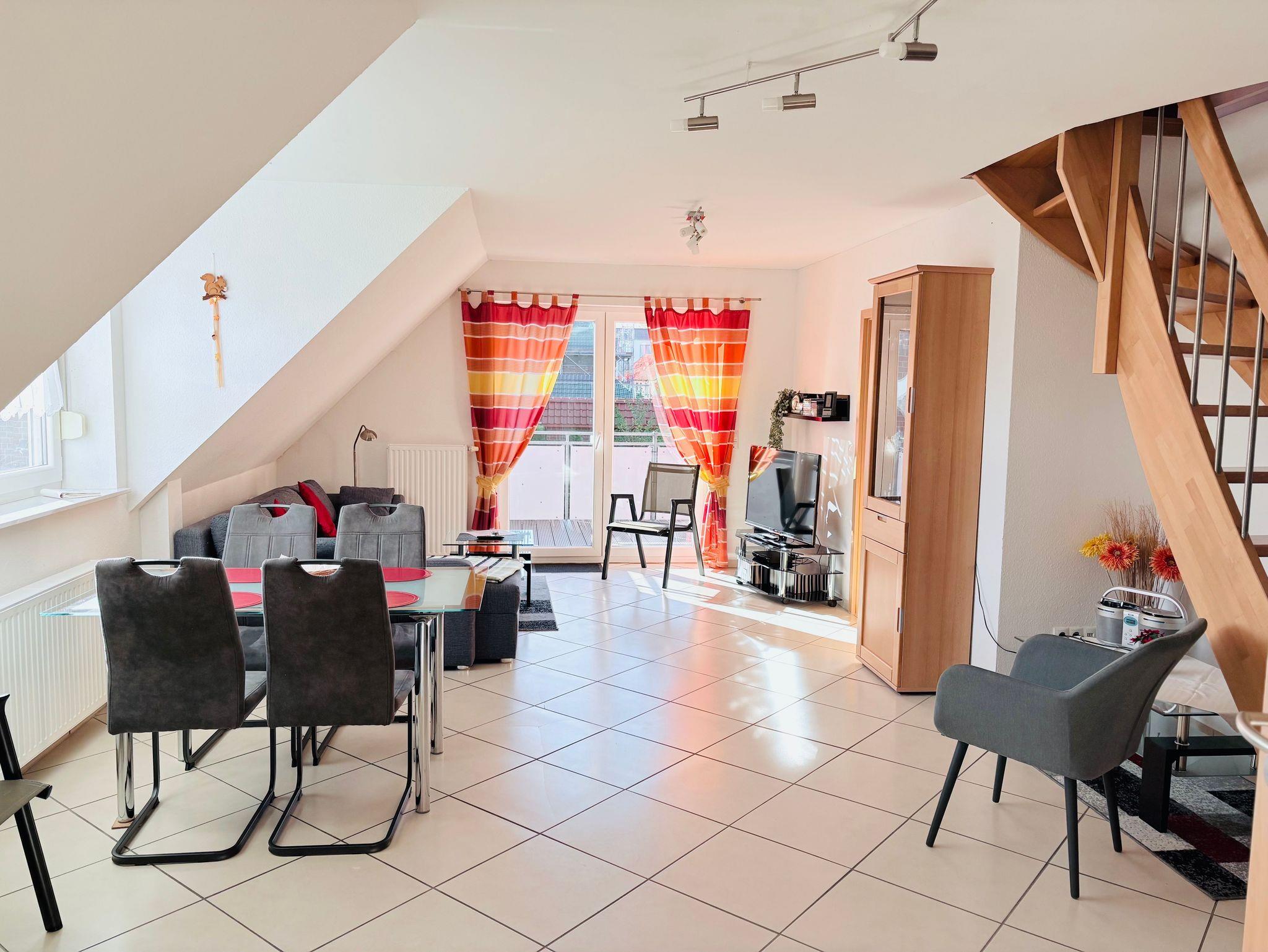 Die Ferienwohnung Achtern erstreckt sich über zwei Etagen ab dem ersten Stock eines Mehrparteienhauses. Im unteren Bereich erwartet Sie ein modernes und großzügig geschnittenes Wohn-/Esszimmer mit einer vollausgestatteten Küche, bequemer Couch und TV. Von diesem Raum aus gelangen Sie auf den weitläufigen Süd-/West-Balkon.