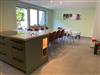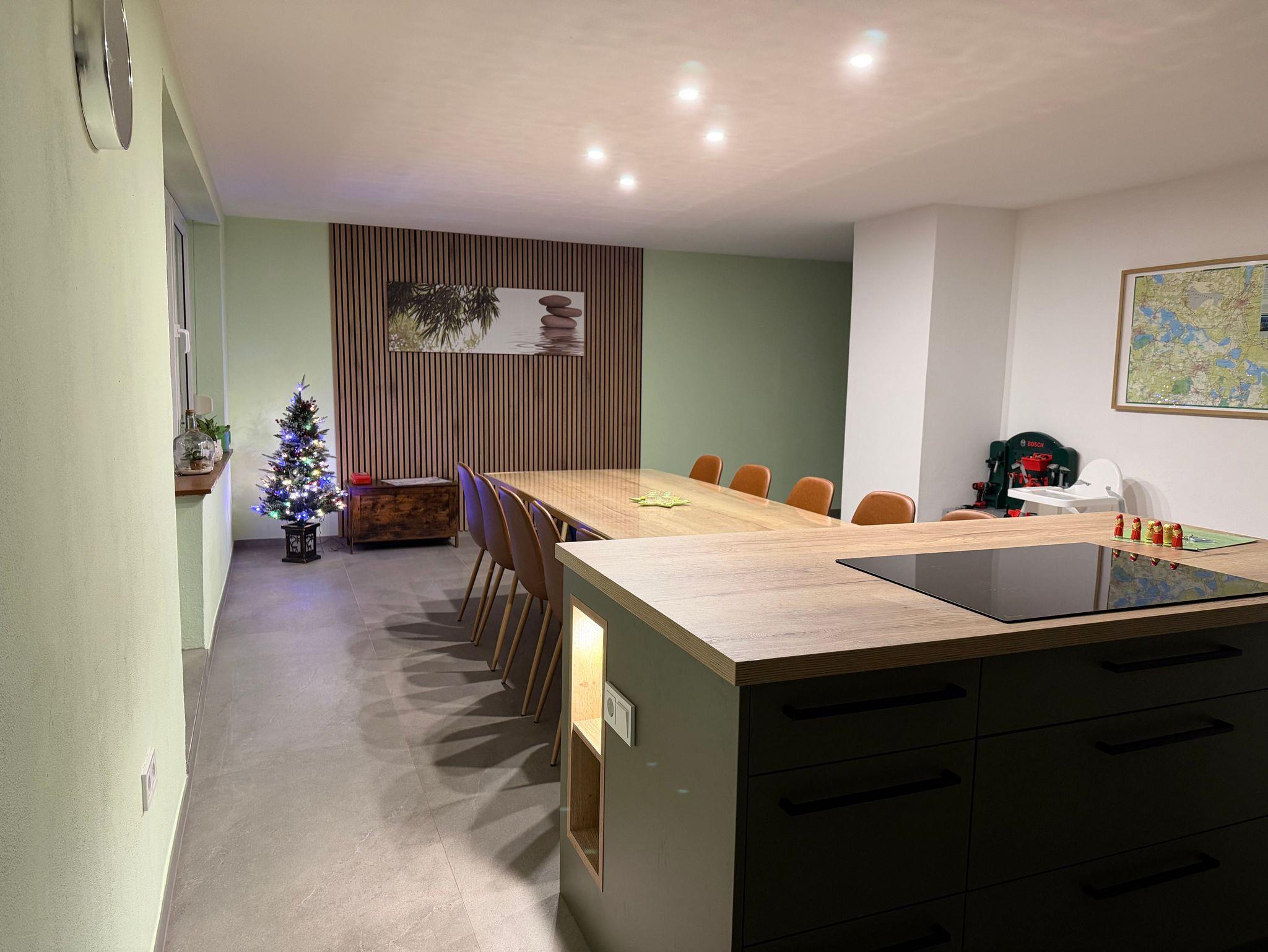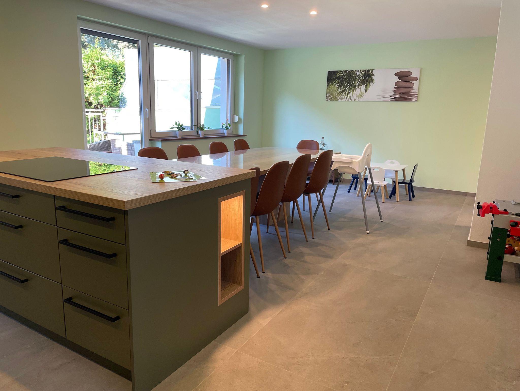 An dem großen Esstisch finden bis zu 10 Personen ihren Platz. Angrenzend ist ein kleiner offener Wohnbereich mit einem Sofa und einem Fernseher.