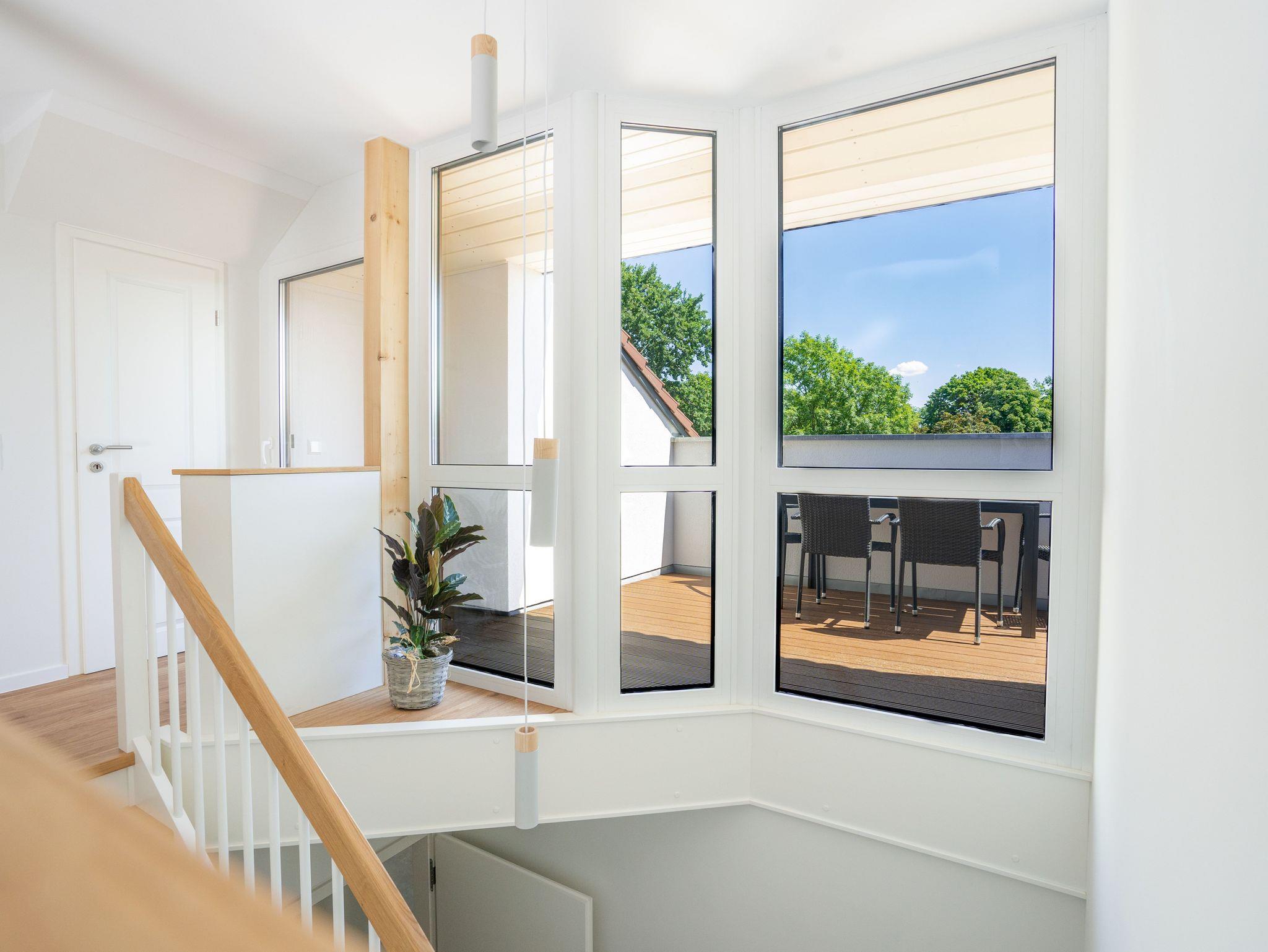 Unsere Lotte ist unsere moderne, aber gleichzeitig urgemütliche Dachgeschosswohnung mit Platz für 2 Personen auf 73m². Das Schlafzimmer verfügt über einen begehbaren Kleiderschrank mit einem beleuchteten Einbauschrank, der sich unauffällig in die Wand integriert. Vom Wohnzimmer mit der großen Couchlandschaft aus hat man Zugang zum Balkon mit herrlichem Blick bis in die Neustadt von Hoyerswerda. Im Bad gibt es eine bodentiefe Dusche, sowie eine Badewanne. Der Lichttunnel sorgt für das nötige Tageslicht im Bad. Auch wenn Lotte unterm Dach liegt, ist erholsamer Schlaf garantiert, denn die Wohnung ist mit einer Decken- und Bodenkühlung ausgestattet. Ein luftiger Treppenaufgang mit separater Garderobe und der verglasten Terrasse gibt dieser gemütlichen Wohnung eine gewisse Leichtigkeit und viel Licht.