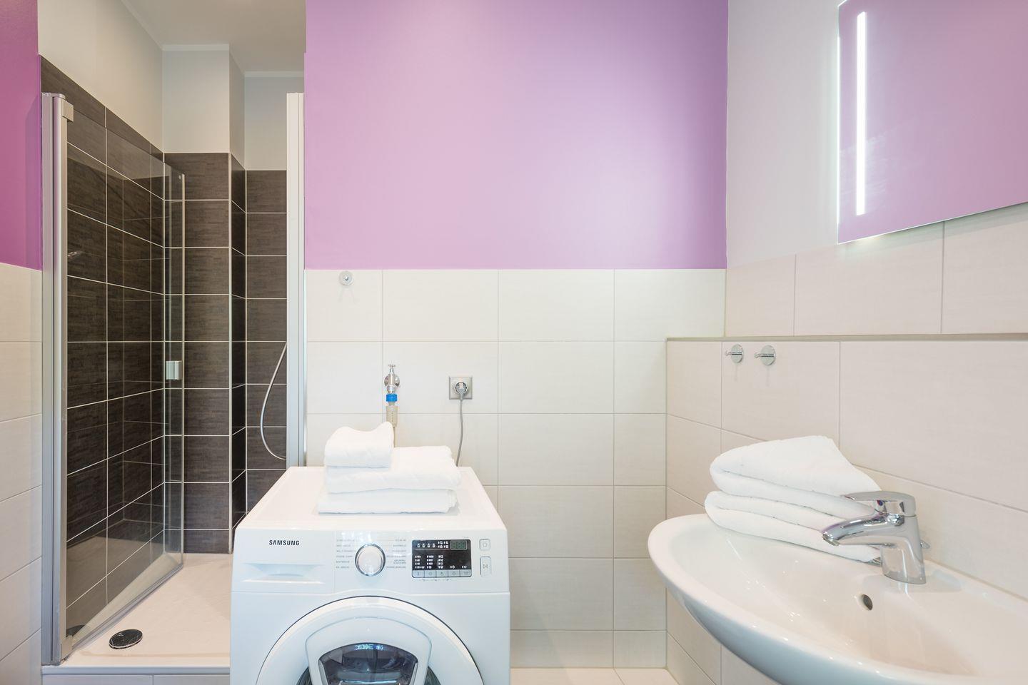 Das Schlafzimmer ist mit einem bequemen Doppelbett (180 x 200) ausgestattet. Das tageshelle Duschbad mit der ebenerdigen Dusche ist zusätzlich um eine Waschmaschine ergänzt.
