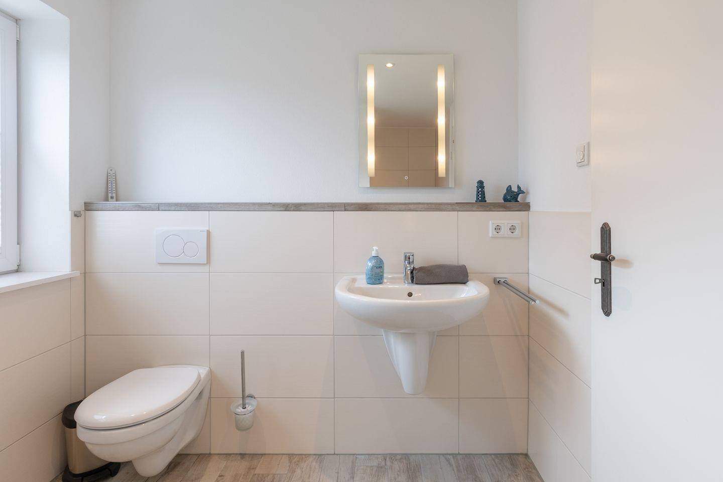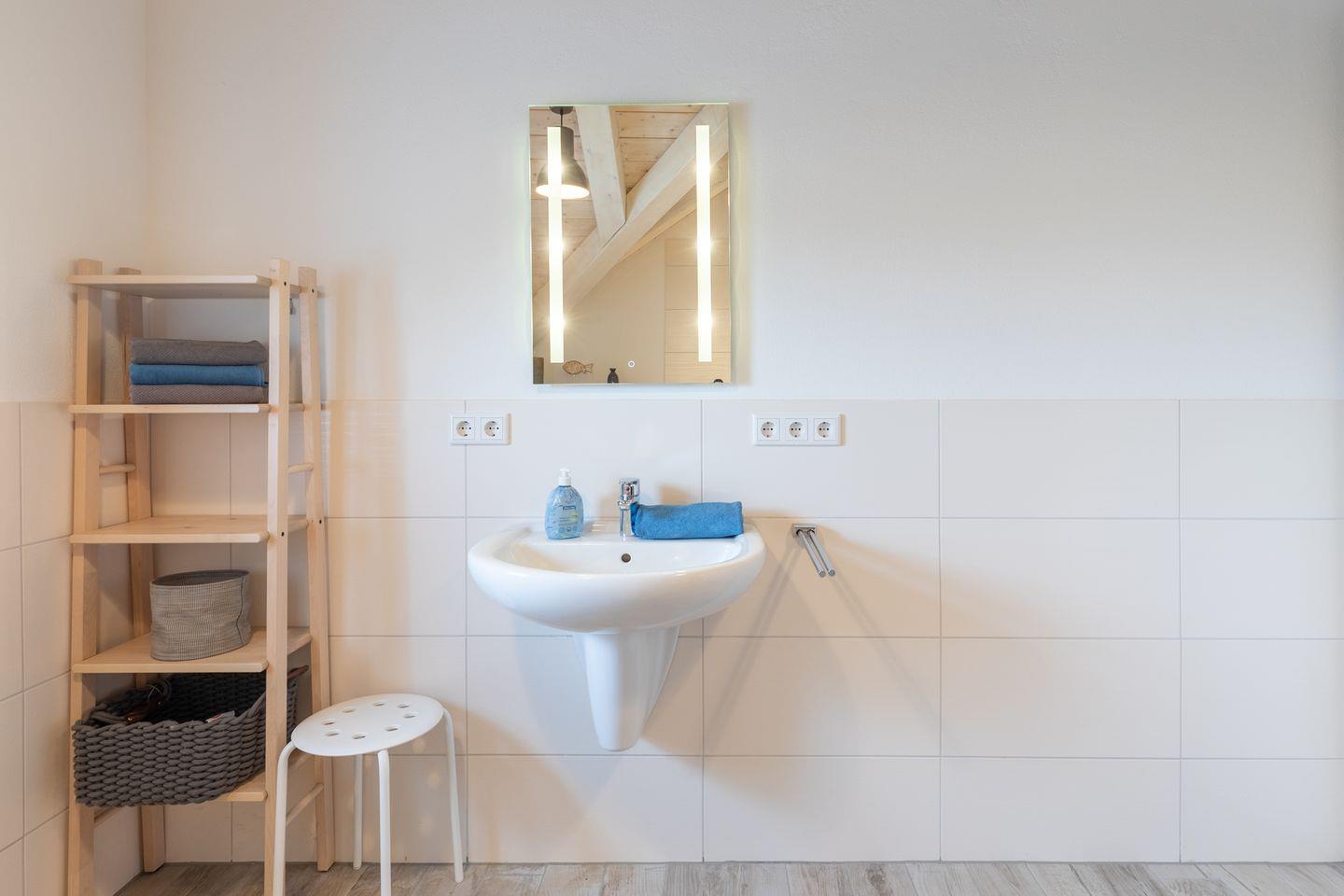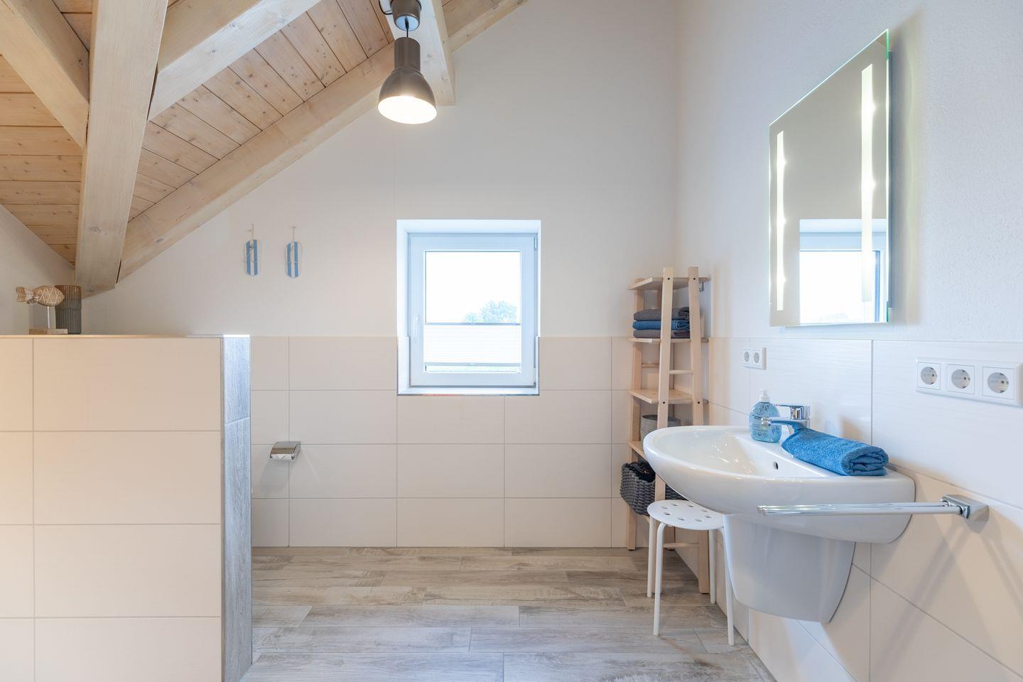 Im Erdgeschoss befindet sich ein modernes Badezimmer mit Walk-in-Dusche.