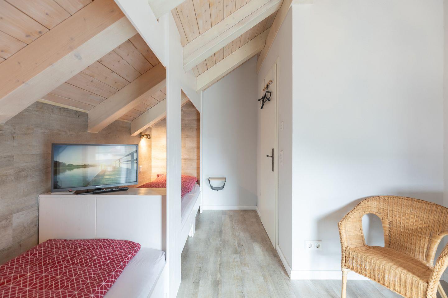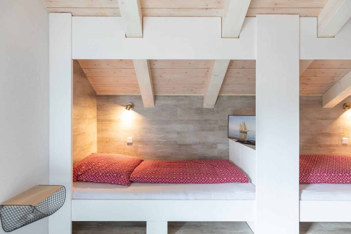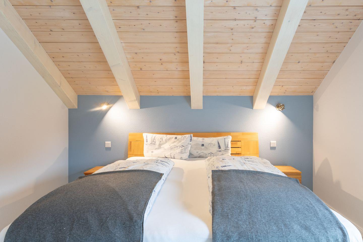 Über eine offene Treppe gelangen Sie in das Obergeschoss mit seinen drei Schlafzimmern mit (1x 180 x 200, 1x 140 x 200 und 2 Kojenbetten). In allen Schlafzimmern steht Ihnen je ein TV-Gerät zur Verfügung. Das große Badezimmer bietet eine geräumige Walk-In-Dusche und eine schöne Sauna. Auf der Galerie ist ein gemütlicher Ruhebereich mit Liegen und TV-Gerät eingerichtet.