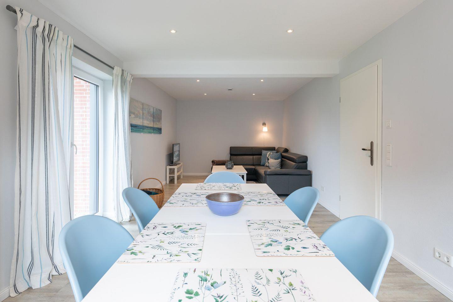 Das Ferienhaus mit ca. 132 qm Wohnfläche ist mit allem ausgestattet, was Sie für einen schönen Nordsee-Urlaub benötigen: Die offene Küche bietet Ihnen einen Herd mit Ceranfeld, einen Backofen, Geschirrspüler, Kühlschrank mit Gefrierfach, Filterkaffeemaschine (Filtergröße 4), Wasserkocher und Toaster. An dem schönen Esstisch steht Familienzeit mit leckerem Essen oder Spieleabenden auf dem Programm.