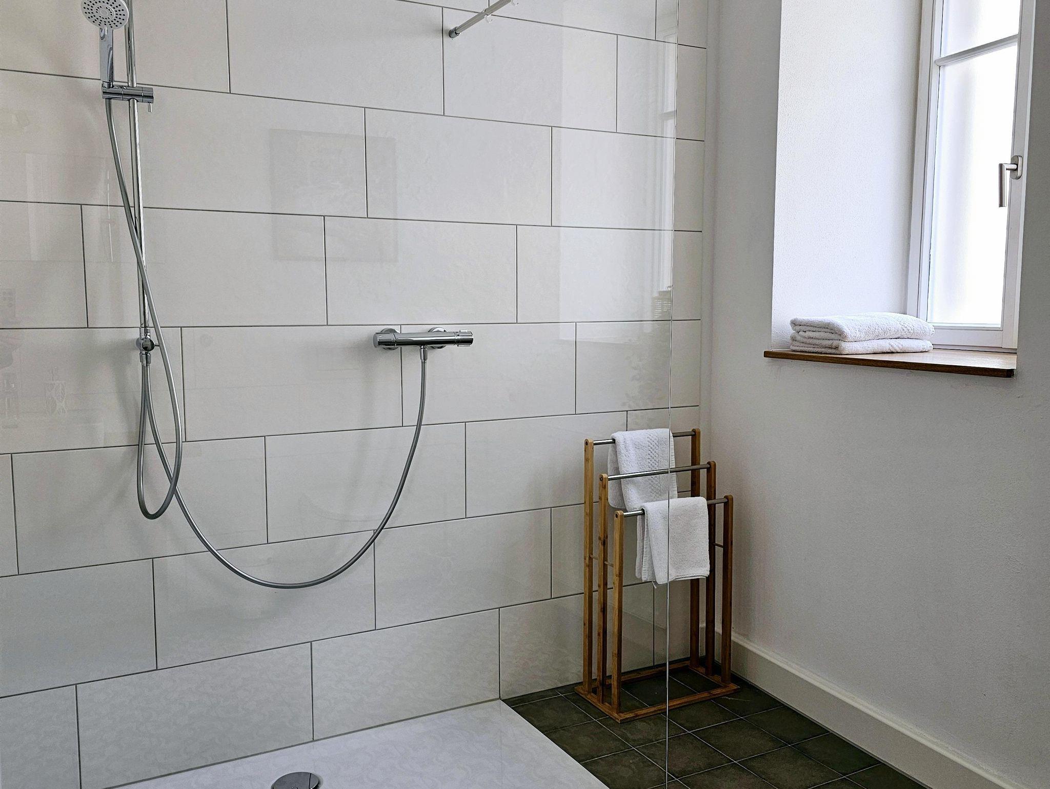 Im vorderen Bereich der Wohnung ist ein großzügiges Badezimmer mit ebenerdiger Dusche, Waschbecken und Toilette. Haarföhn und Handtücher liegen für unsere Gäste selbstverständlich bereit.