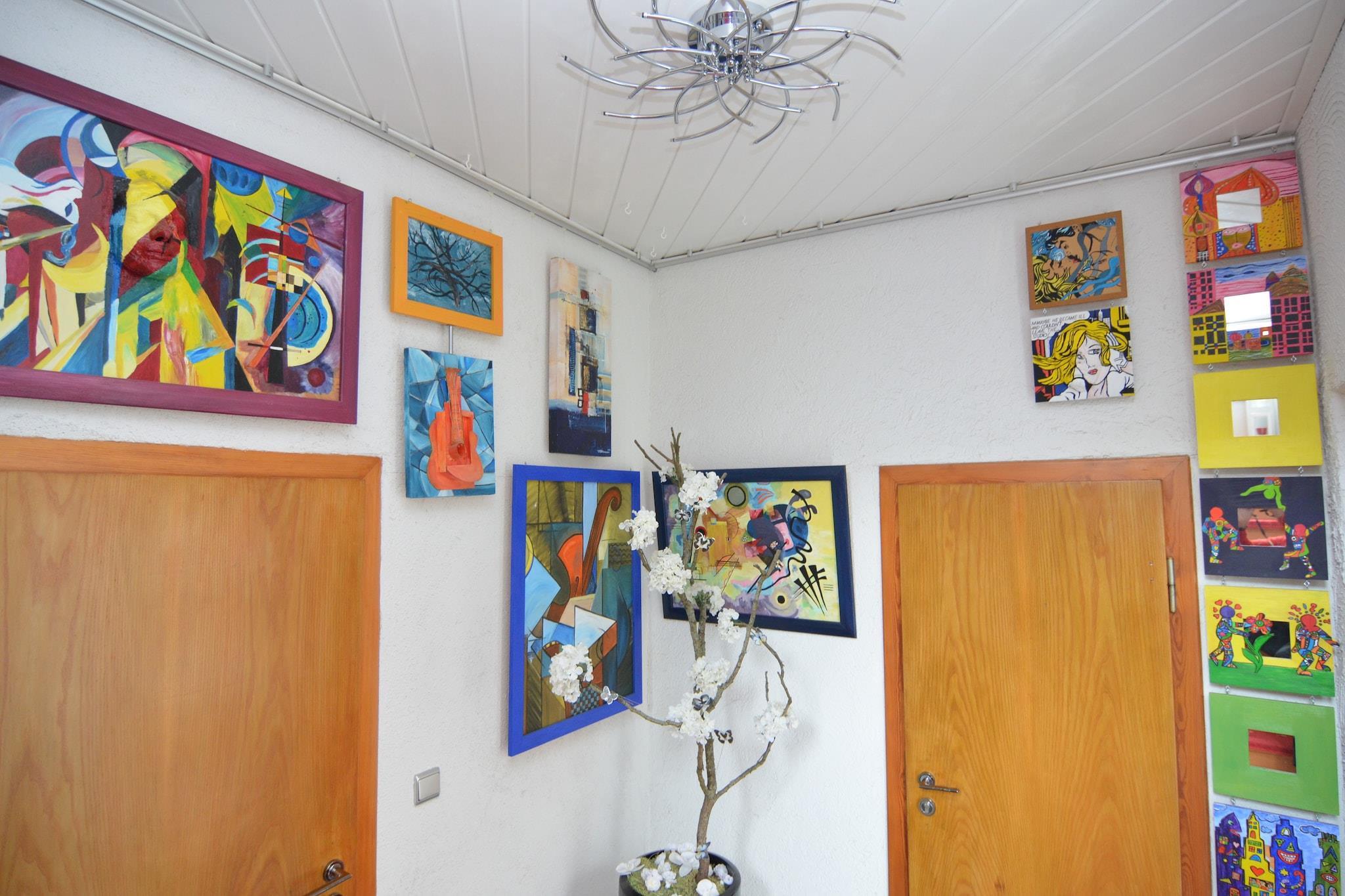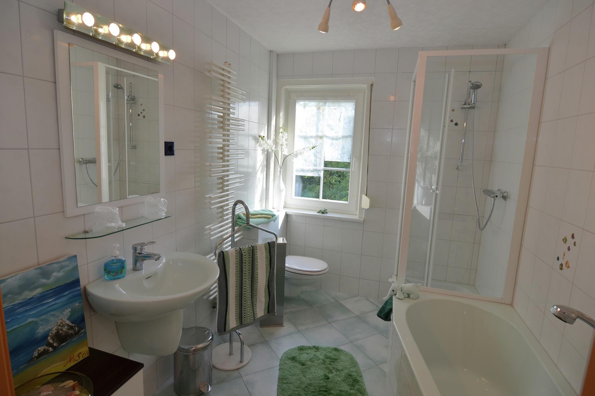In der 1. Etage: (Küche(Esstisch, Wasserkocher, Toaster, Kochherd(4 Kochplatten, Ceranfeld, elektrisch), Kaffeemaschine(Filter), Backofen, Mikrowelle, Spülmaschine, Kühl-/Gefrierkombination), Wohn-/Schlafzimmer(Doppelbett, TV(Kabel), Sitzecke, Radio), Badezimmer(Badewanne, Dusche, Waschbecken, Toilette, Föhn)) Aufenthaltsraum, Heizung(Zentral, Öl), Parkplatz