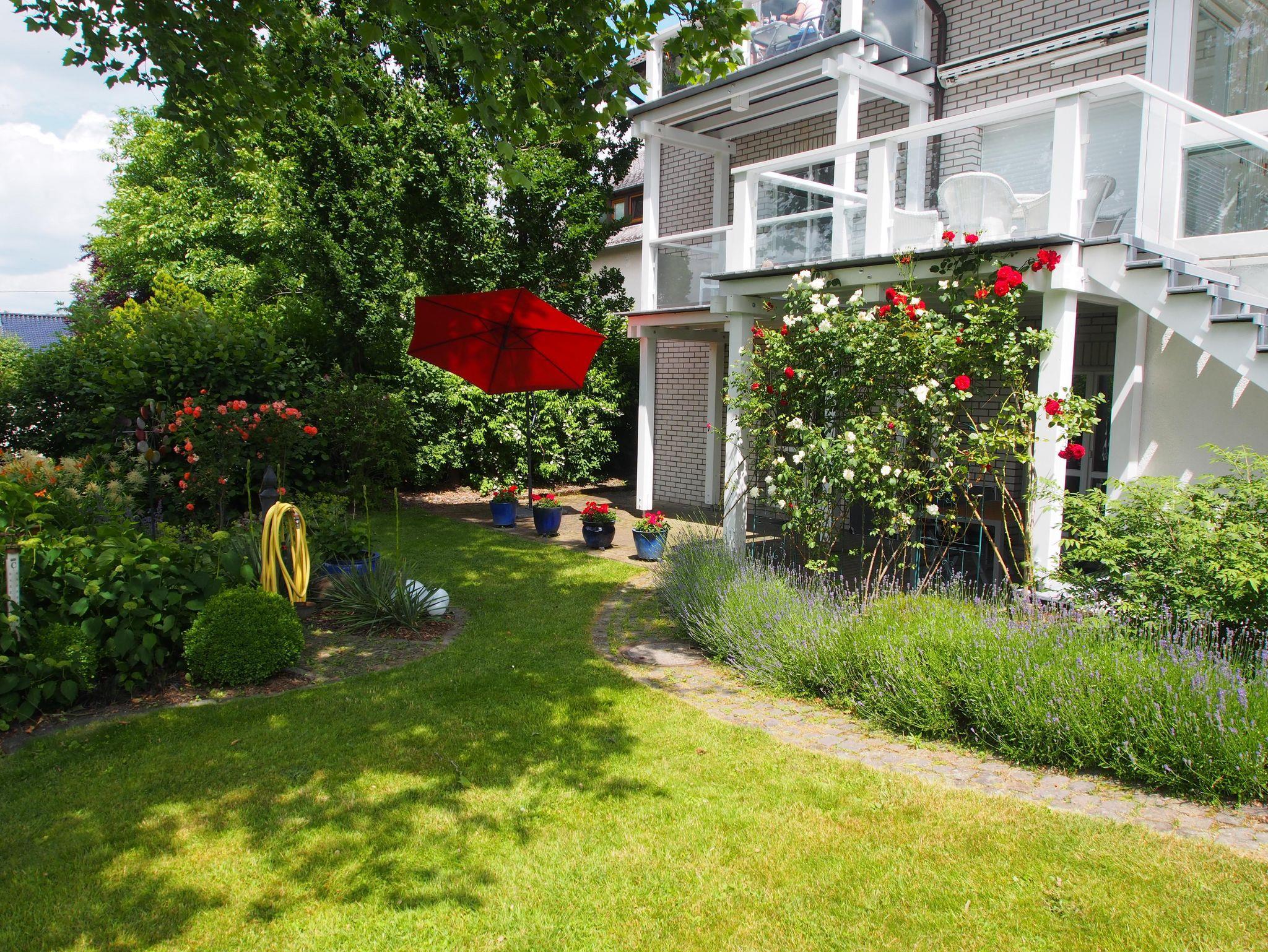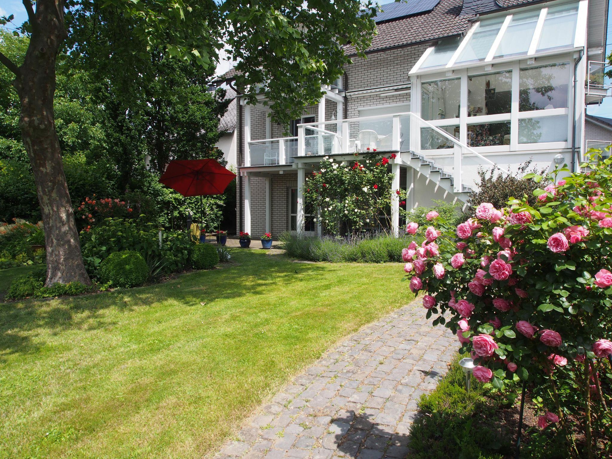 Die Wohnung ist gefliest und hat Fußbodenheizung. Vom Schlafzimmer und Wohnzimmer gehen Türen auf die große Terrasse (36 m²). Von hier aus sieht man in den Garten (2000 m²).