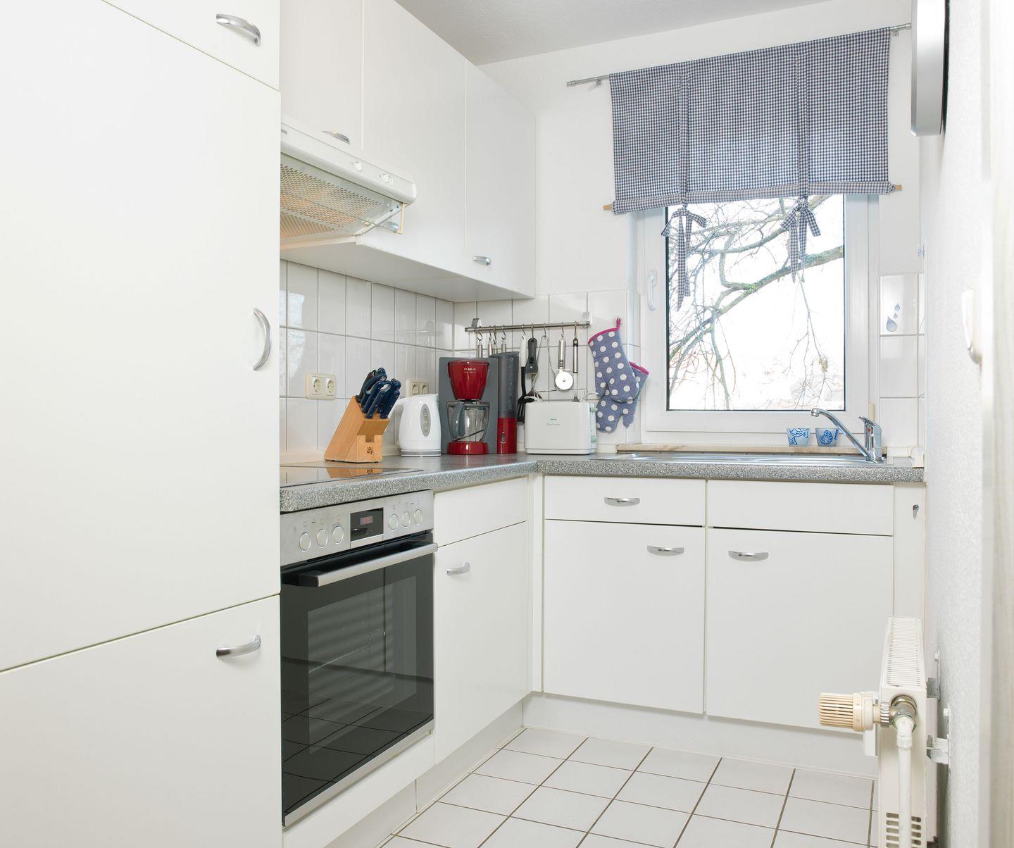 Das freundliche Wohnzimmer mit einer Küchenzeile lädt ein zum gemütlichen Verweilen. Die Küche verfügt über einen Ceran-Herd, Backofen, Kaffeemaschine etc.