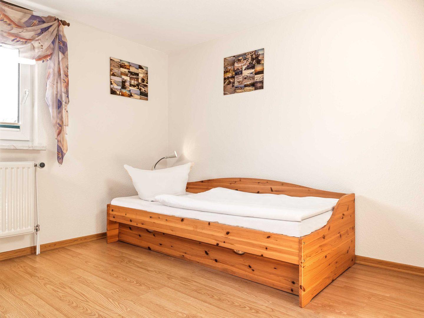 Die Wohnung verfügt über ein Schlafzimmer mit einem Doppelbett (140x190) und einem Einzelbett mit einer Aufbettung.