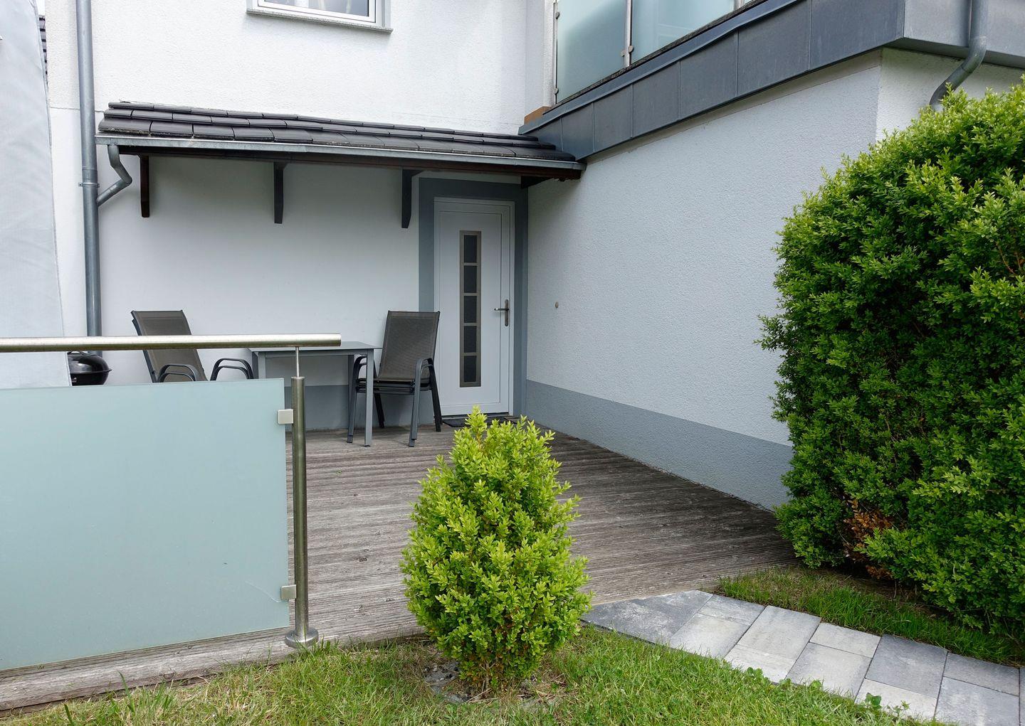 An schönen Tagen lockt die Terrasse, die mit Gartenmöbeln, Sonnenschirm und Grill ausgestattet ist.