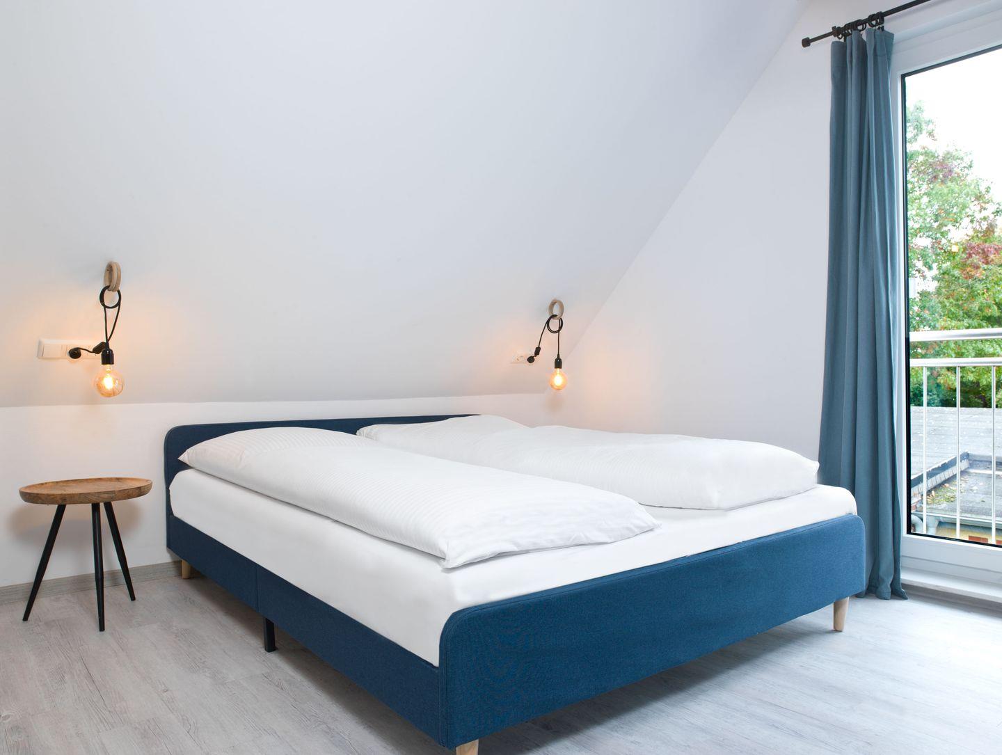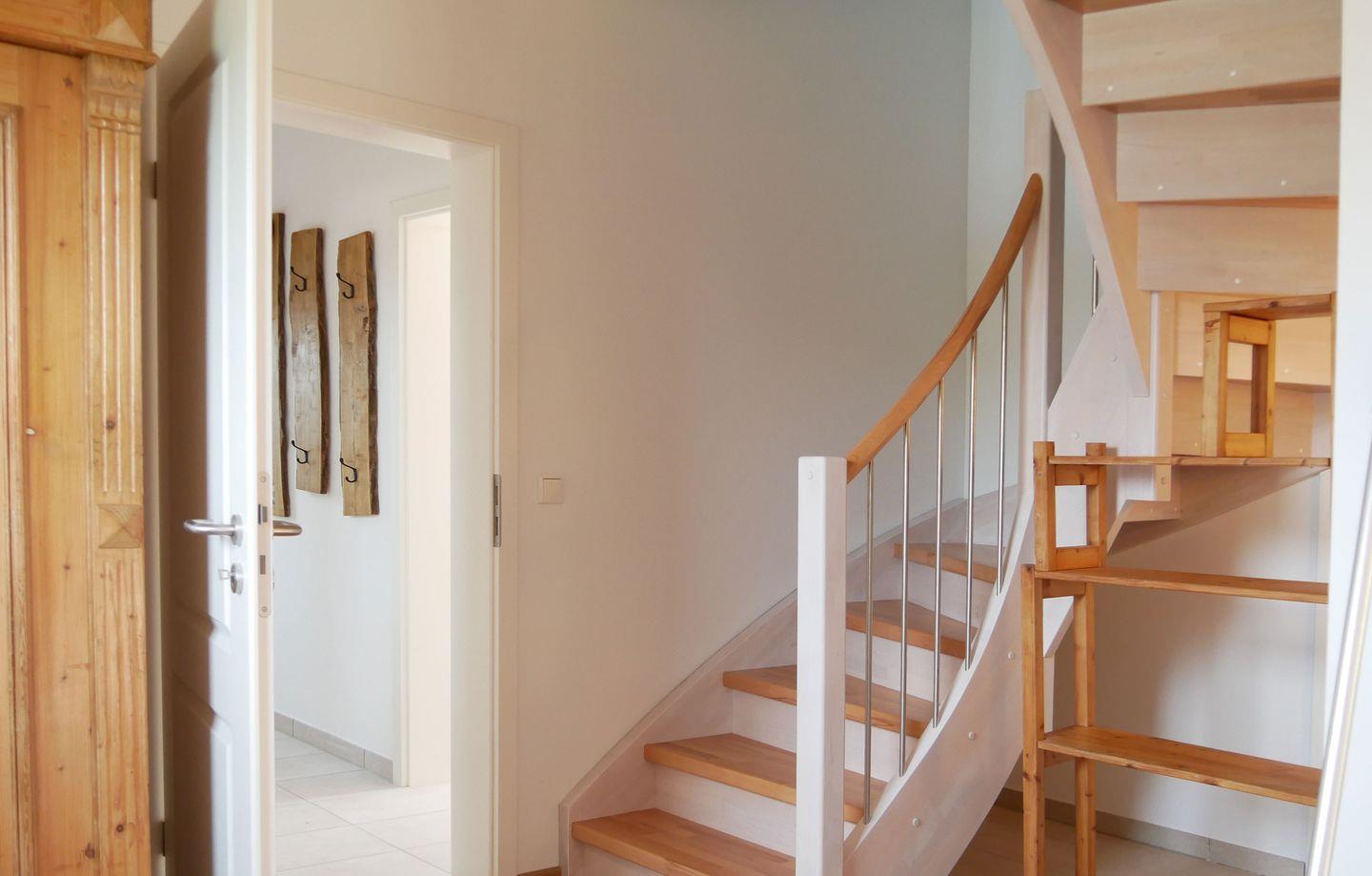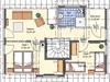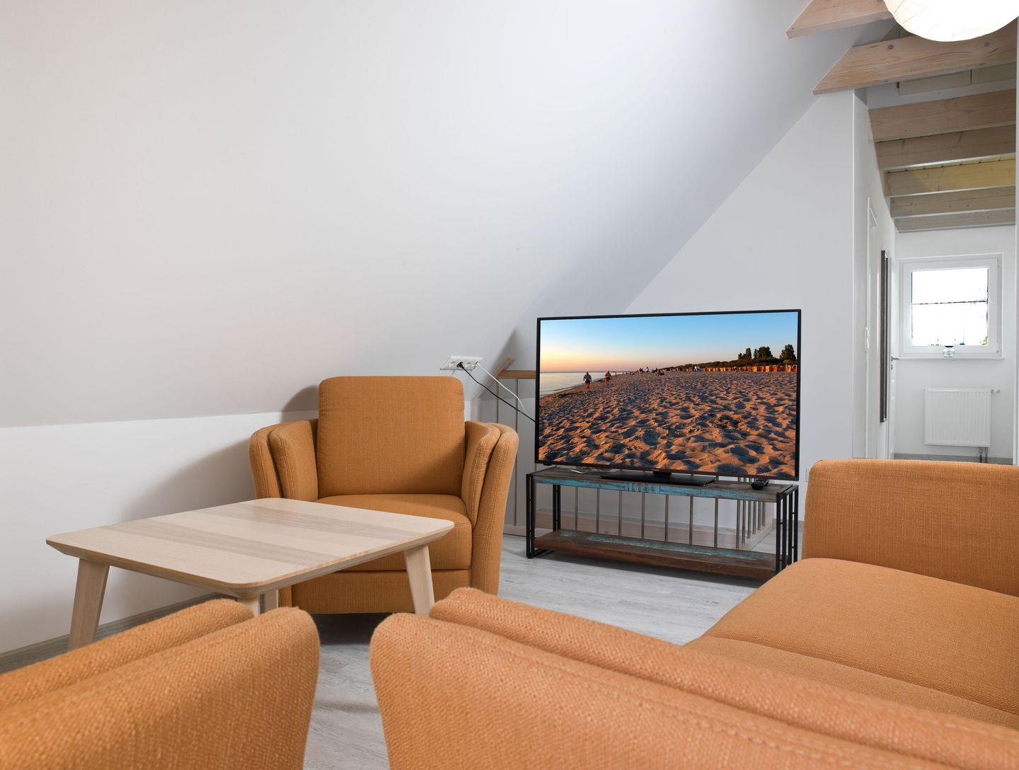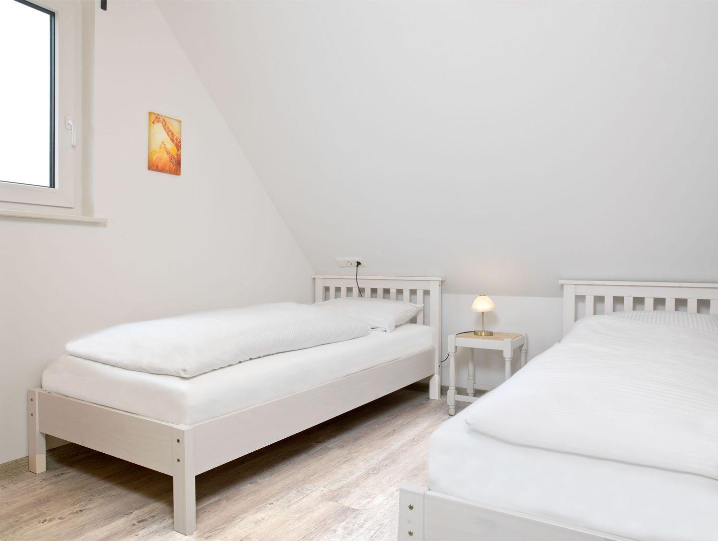 Im OG befindet sich ein Schlafzimmer mit Doppelbett, ein Schlafzimmer mit zwei Einzelbetten, ein Bad mit Dusche und WC sowie eine gemütliche Sitzecke mit TV.