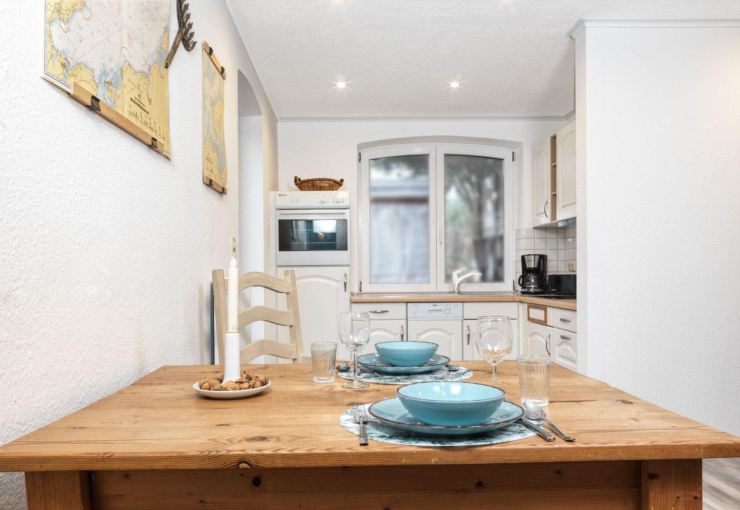 Bad mit Dusche und WC, schöne Einbauküche mit einem Esstisch, Cerankochfeld, Kaffeemaschine etc.. Das kuschelige Wohnzimmer bietet mit einem Schlafsofa und Flach-TV Raum für ruhige Stunden.