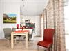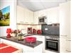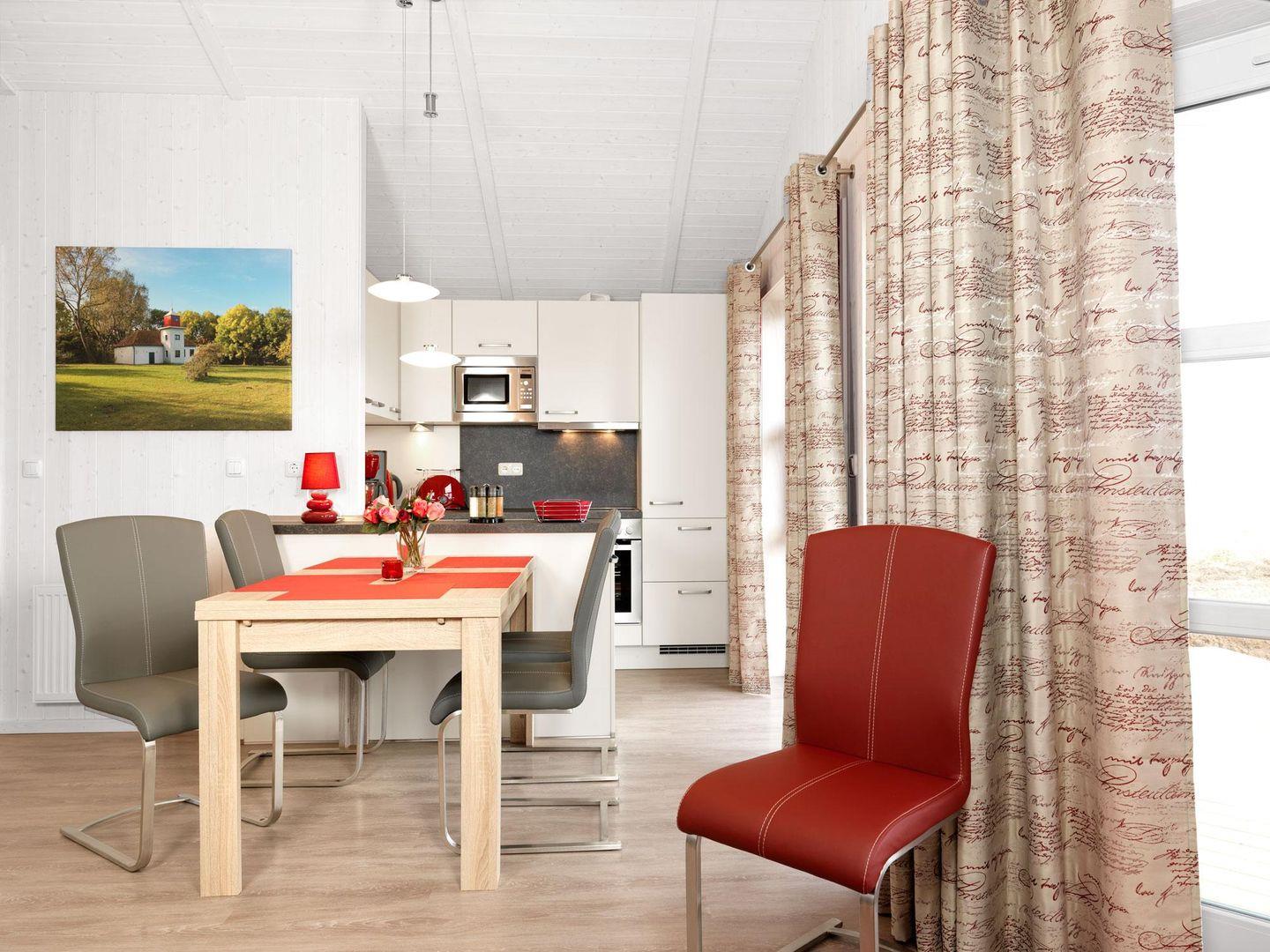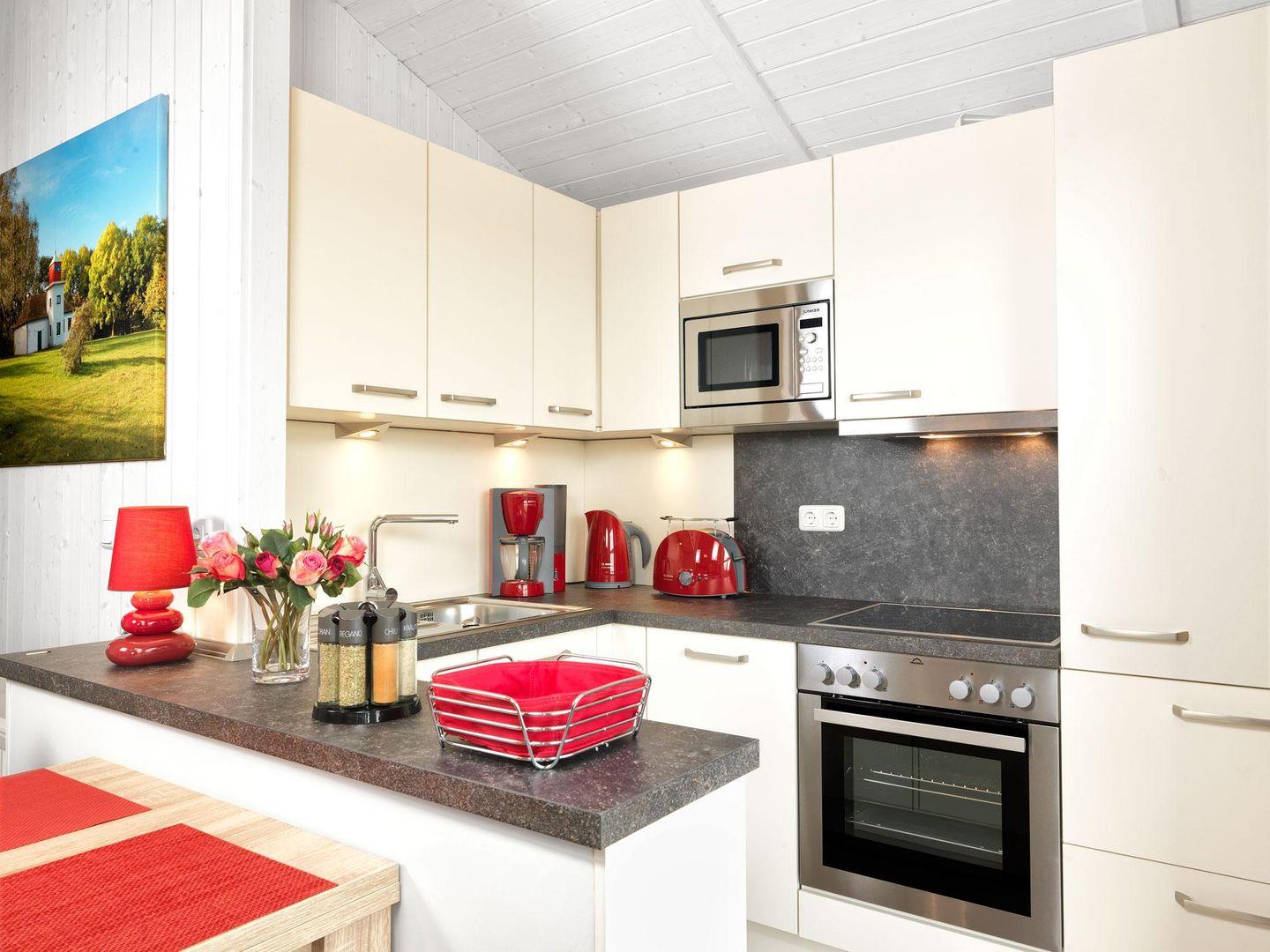 Die angrenzende offene Küche ist komplett und perfekt ausgestattet. Vom Wohnzimmer gelangt man auf die Terrasse und von dort auf die sich anschließende große Wiese.