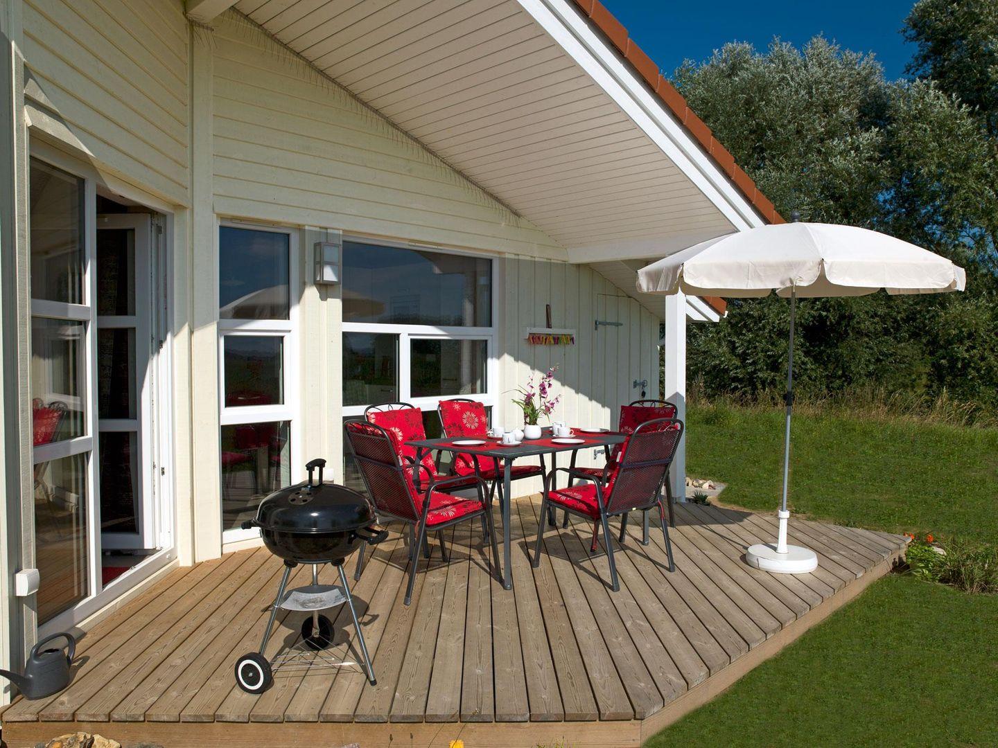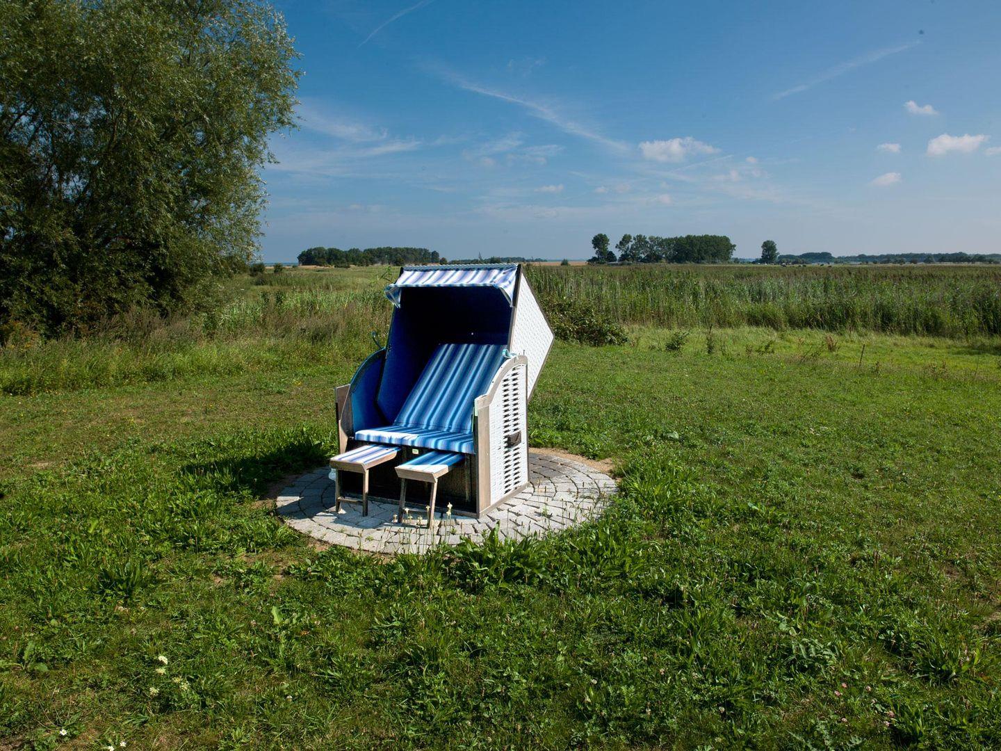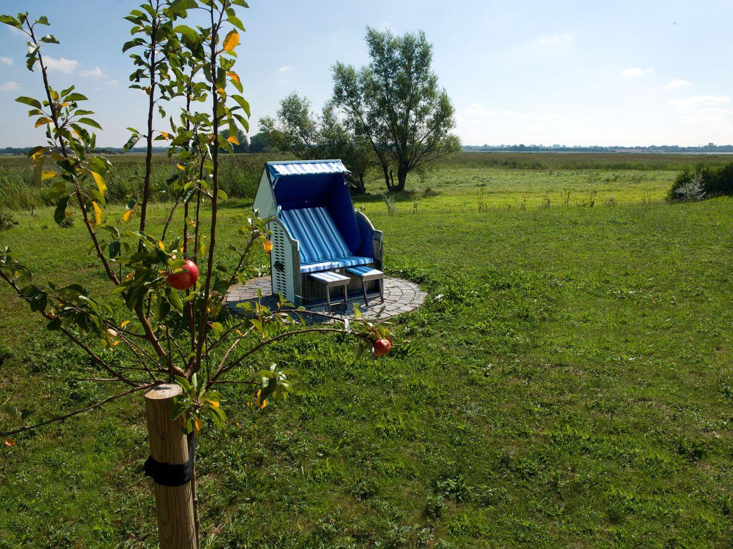 Hier bietet sich viel Platz zum Spielen und zum Erholen. Ein Strandkorb und Gartenmöbel sind selbstverständlich vorhanden ebenso wie ein Grill.