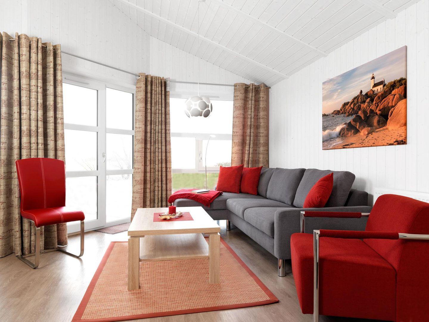 Das Wohnzimmer mit den großen Fenstern und den modernen leichten Möbeln ist sehr hell.