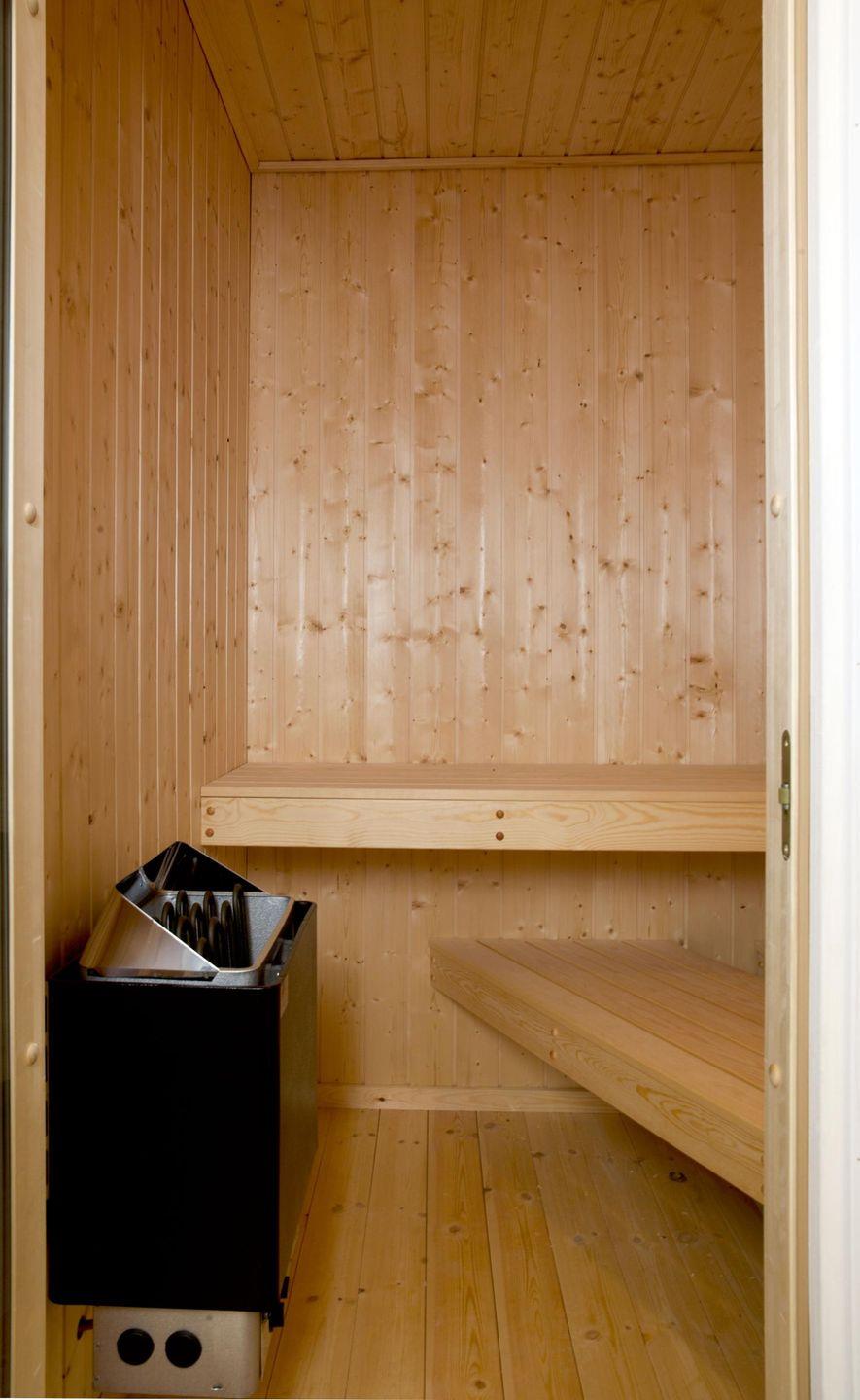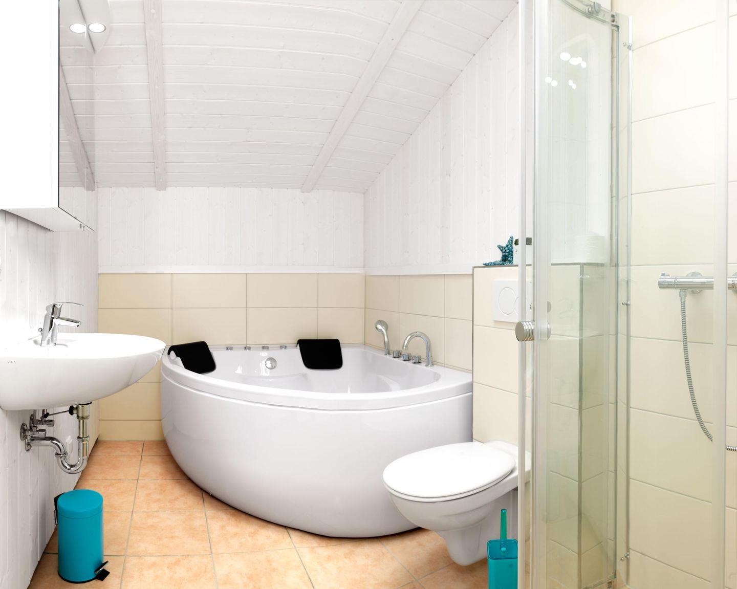 Es gibt zwei Bäder. Ein Bad mit Dusche und Sauna sowie ein Bad mit Whirlpool.