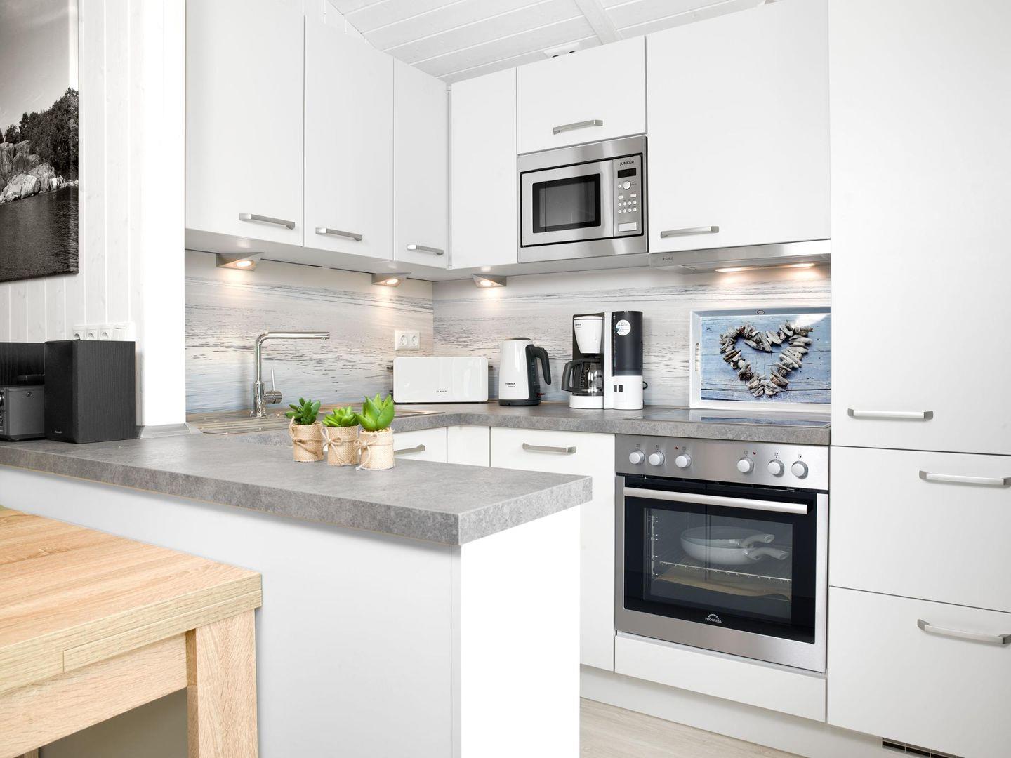 Das Wohnzimmer mit den großen Fenstern und den modernen leichten Möbeln ist sehr hell. Die angrenzende offene Küche ist komplett und perfekt ausgestattet. Vom Wohnzimmer gelangt man auf die Terrasse und von dort auf die sich anschließende große Wiese.