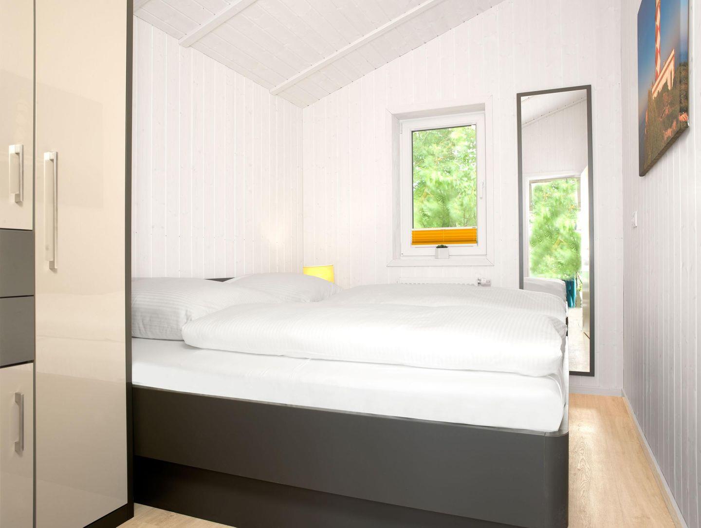 Zwei Schlafzimmer, eines mit Doppelbett und das andere mit zwei Einzelbetten ergänzen die Wohnung. Eine Schlafcouch (für eine Person) befindet sich im Wohnzimmer.