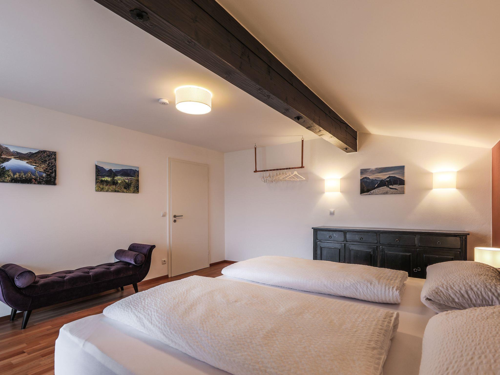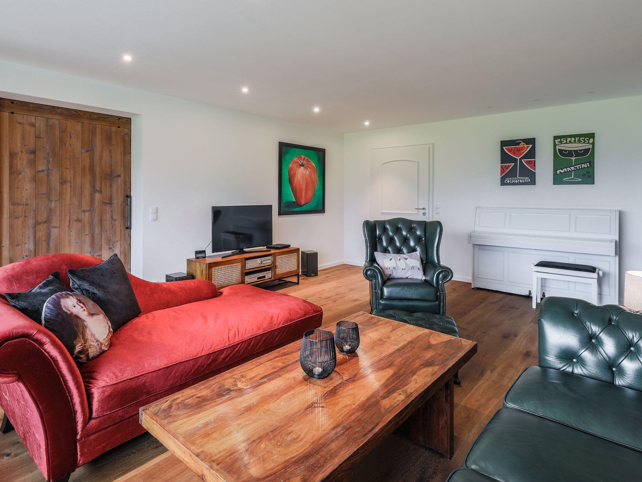 Im Dachgeschoss befinden sich 2 DZ (20m² und 15m²), das 4-Bett Kinderzimmer (18m²), ein Bad und eine extra Toilette.Ein weiteres DZ mit Bad (21m²) ist im Erdgeschoss. Dazu Küche, Wohnzimmer, Stüberl mit beheizbarem Kachelofen (Holz vorhanden), Bibliothek/Arbeitszimmer, extra Garderobe.Die Küche enthält• Geschirrspüler • Kühlschrank mit Gefrierfach • Induktionsherd mit 4 Platten, große Auswahl an Töpfen und Pfannen. • ein Backofen• Konventionelle Filterkaffeemaschine, Nespresso Kapselmaschine, Espressokanne • Toaster • Geschirr und Besteck für 10 Personen • sonstiges: von Standardgewürzen bis Kaffeefilter und Müllbeutel sollten Sie alles vorfinden, was Sie brauchen. Auch an Spülmittel brauchen Sie nicht zu denken. Im Keller können Sauna, Ruheraum und Spielzimmer genutzt werden. Des weiteren steht eine Waschküche und ein Trockenraum zur Verfügung.Insgesamt ca. 210m² Wohn- und Nutzflättwäsche und Dusch/Handtücher werden gestellt. (Bitte ggf. Bademantel und Saunatuch selbst mitbringen) In den 2 Bädern sind je ein Haartrockner vorhanden.Waschmaschine und Trockner in der Waschküche.WLAN, Drucker, TV, Musikanlage, PS4, Profi Kicker, Darts, Brettspiele, Bücher aus der Bibliothek, Klavier, Kinderbett stehen zur Verfügung.Terrasse und Garten:Auf der teils überdachten Terrasse lässt es sich auf den Lounge Möbeln gut aushalten (kleine Untertreibung), oder auf den Sonnenliegen in der Wiese, bzw. unter dem 40 jährigen Apfelbaum einfach nur die Umgebung genießen.Ein Grill, der große Holztisch mit Bänken und das leckere BBQ kann beginnen. An der Garage befindet sich eine Wallbox zum Laden von E-KFZ.Die Garage selbst ist relativ schmal (da Baujahr 1977) und ist idealerweise als Rad und Skidepot zu nutzen.