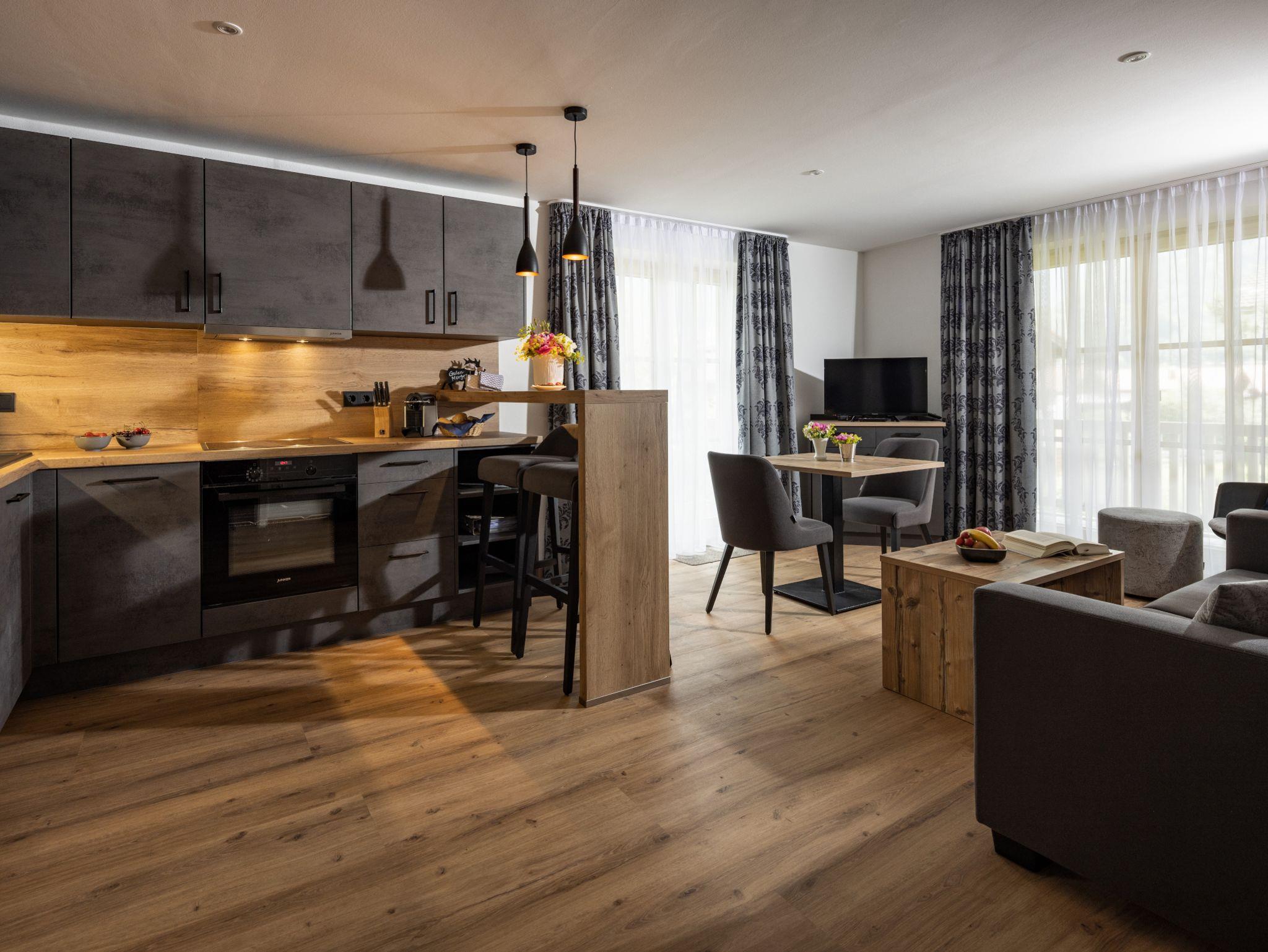 Hubertus Appartements - Chiemgau Karte, Appartement 2 Falkenstein bis 3 Personen, Küche, Schlafzimmer, 50 qm