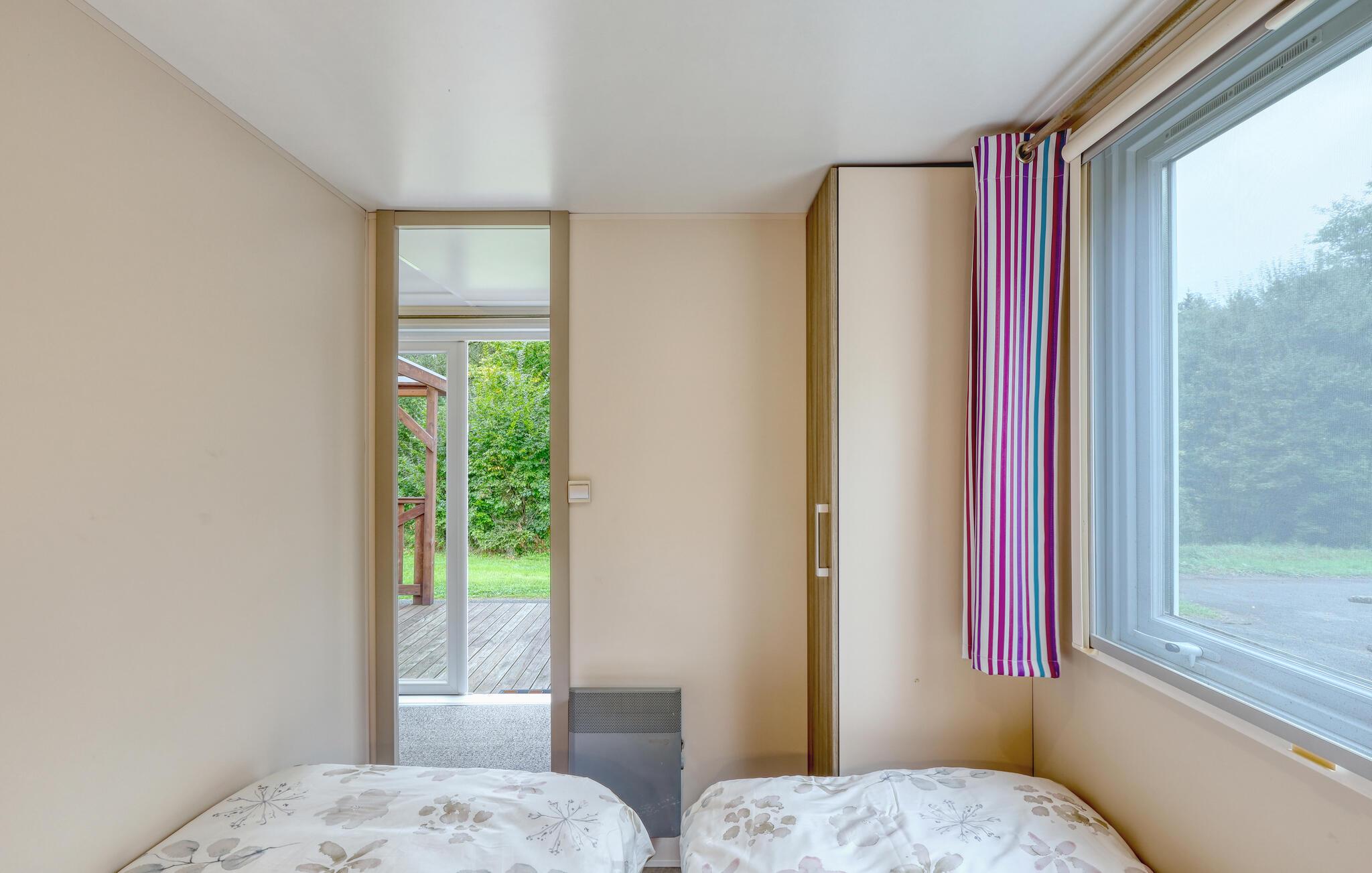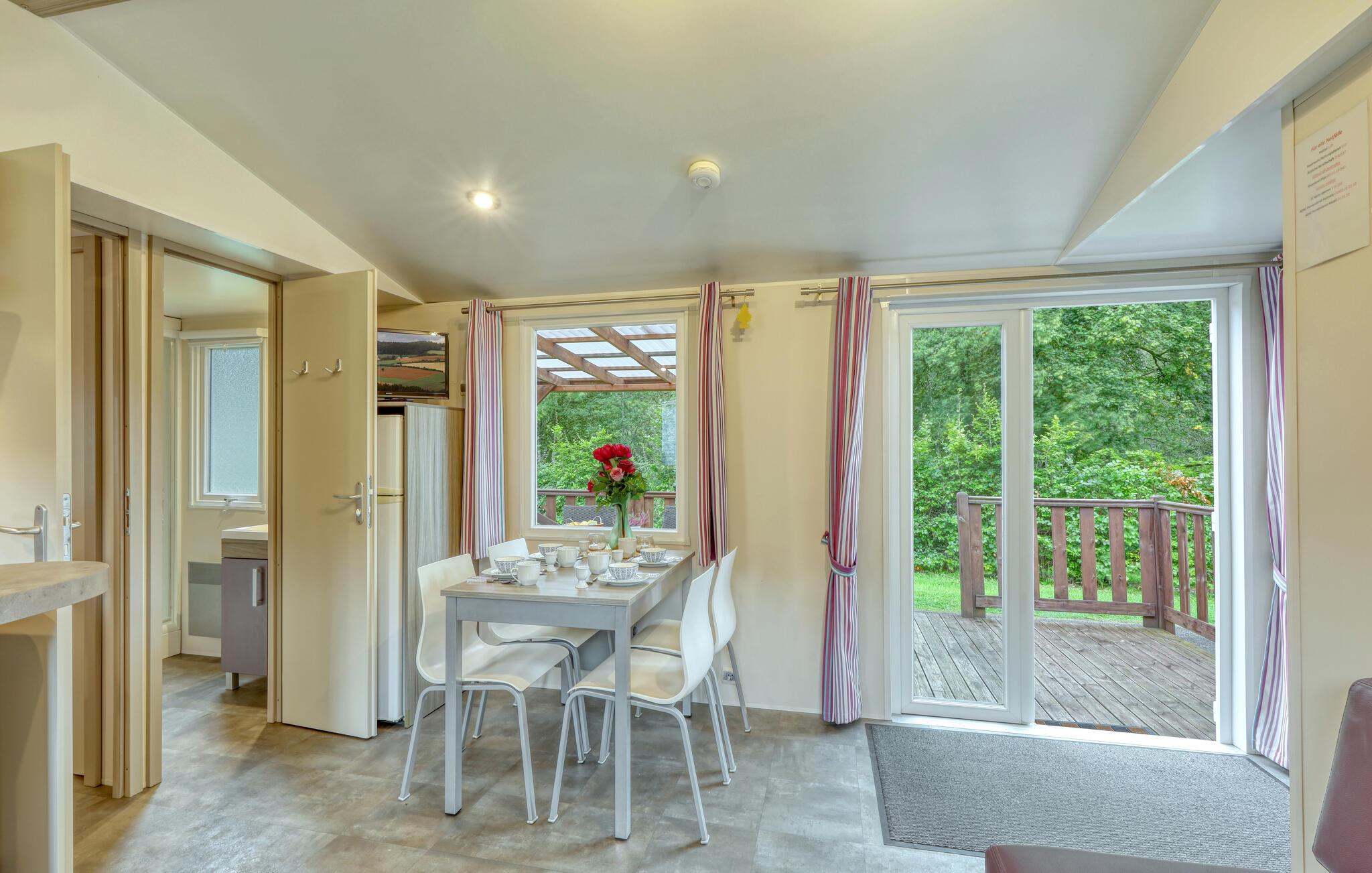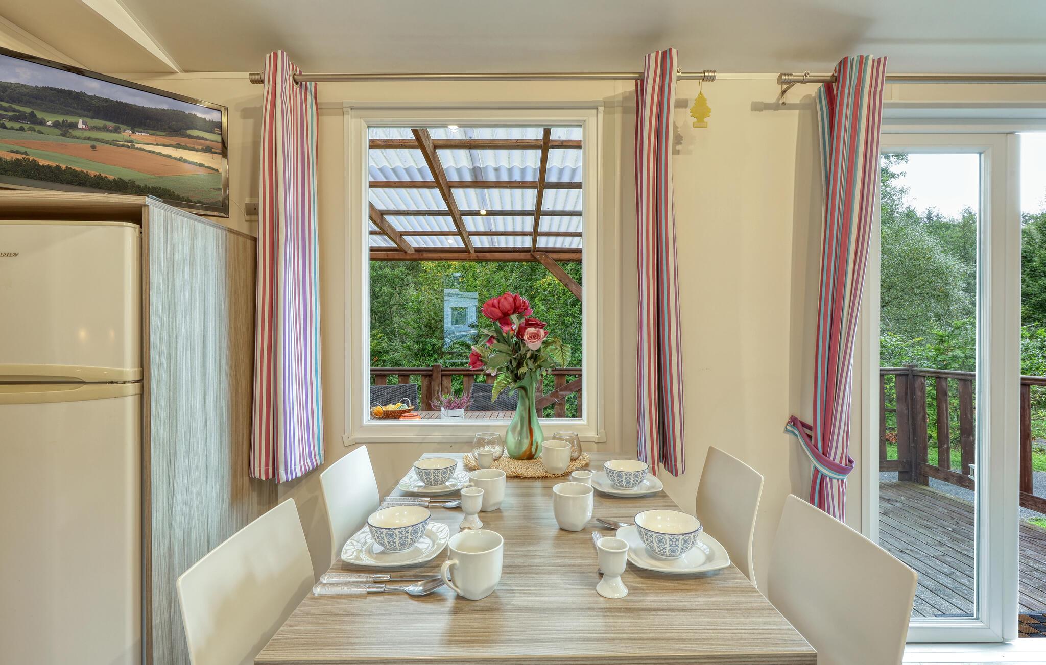 In schöner Lage auf einem Campingplatz nahe dem Wald empfängt das Haus seine Gäste. Nutzen Sie es als gemütliche Basis für eine schöne Auszeit mit Erkundungen der Umgebung und Erlebnissen in der Natur. Genießen Sie schon beim Aufwachen einen schönen Blick ins Freie, lassen Sie sich in den behaglichen Räumen nach Ihren Ausflügen häuslich nieder und schmieden Sie beim Entspannen im ansprechenden Wohnbereich Pläne für die kommenden Tage.