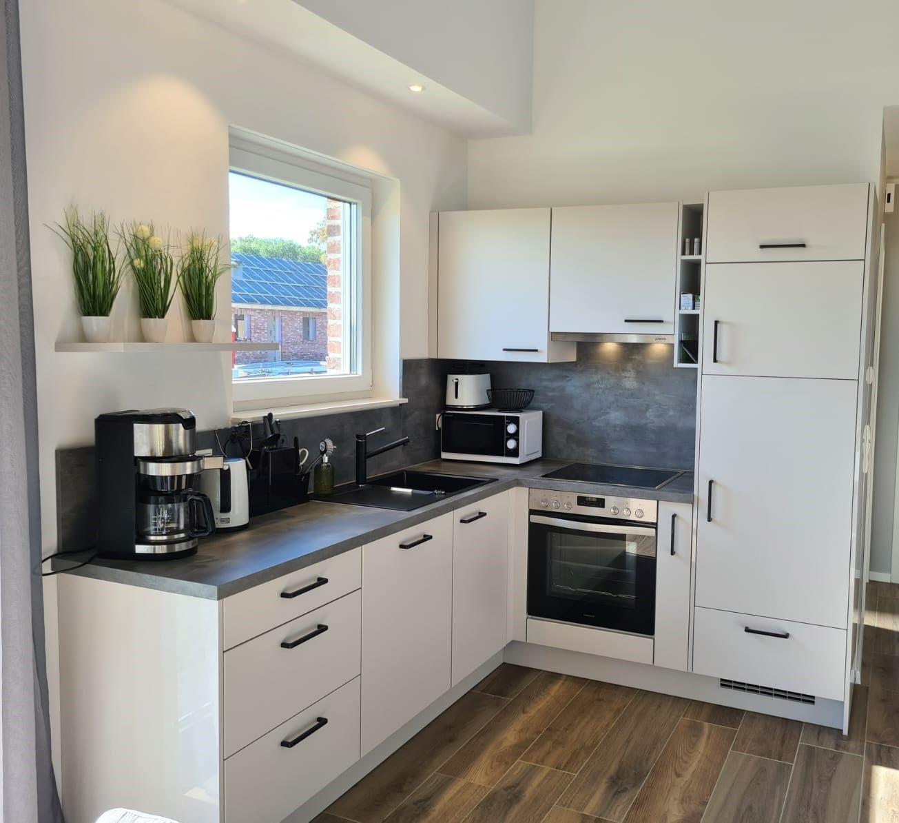 Die anschließende halb offene Küche ist bestens ausgestattet und verfügt über reichlich Platz für gemeinsames Kochen.