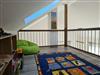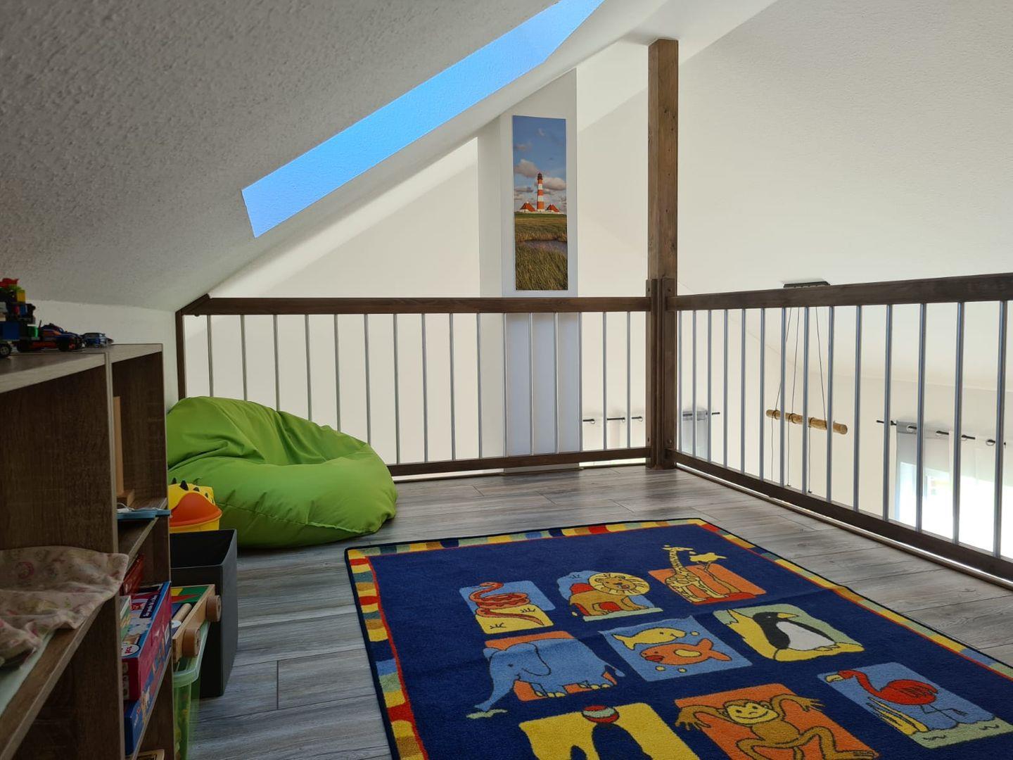Über eine Treppe gelangt man aus dem Wohnbereich auf eine Spielebene, auf der bereits diverse Spiele und Bücher warten.